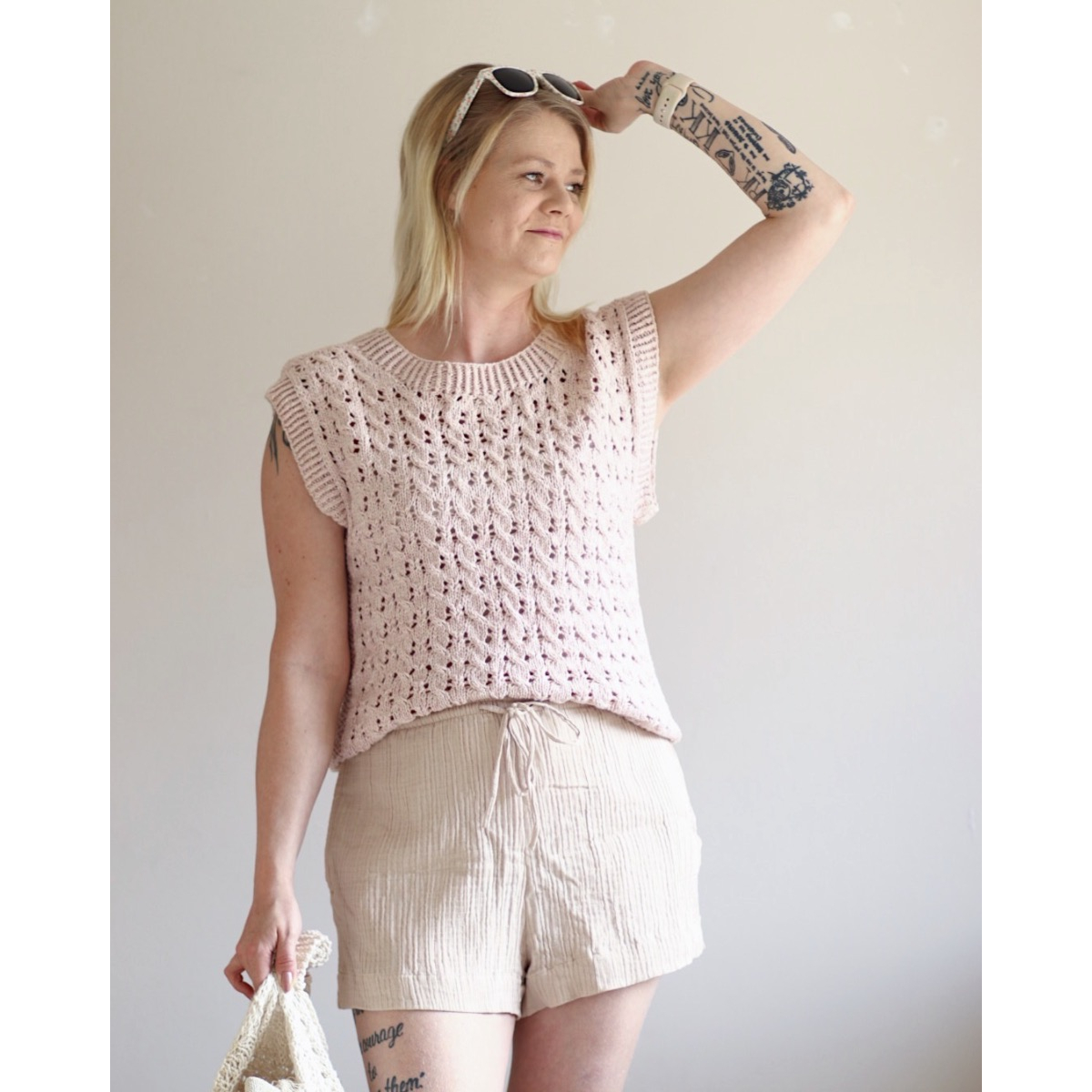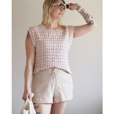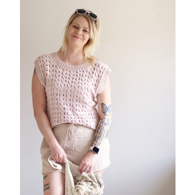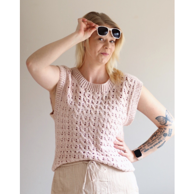 Kesän lämpöisiin päiviin hieman pitsiä ja palmikkoa. Andina-toppi neulotaan ylhäältä alas. Olkapäitä koristaa helmineule.