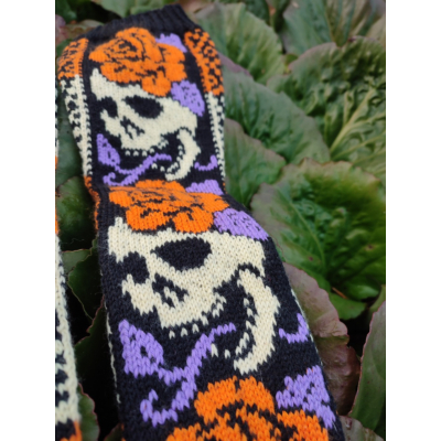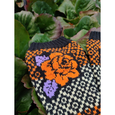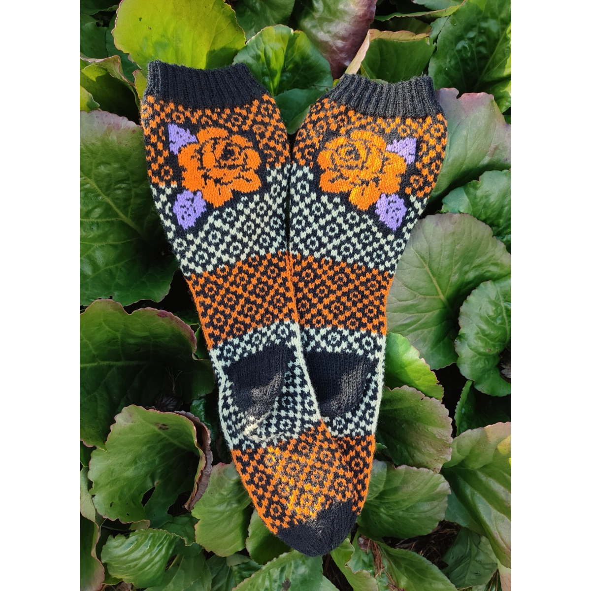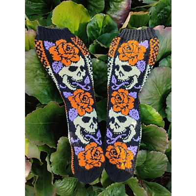 Suomalaisen sananlaskun mukaan se parhaiten nauraa, joka viimeksi nauraa, ja sanonta näkyy pätevän ainakin näiden sukkien iloisiin ruusutarhureihin. Sukissa on vahvistettu ranskalainen kantapää ja kärjessä sädekavennukset, ja ne voi neuloa joko pitkinä tai lyhyinä. Pidemmässä kolmen ruusun versiossa on muotoillut varret ja kaksi eri pohkeenleveyttä. Sukat on mahdollista tehdä kaksivärisinä tai useammalla värillä kuten valokuvien halloween-sukat on tehty. Jälkimmäisessä tapauksessa kannattaa ensin neuloa koko sukka tavallisena kirjoneuleena (kaksi väriä per kerros) ja värittää lopuksi silmukoita jäljentämällä tarvittavat osuudet.