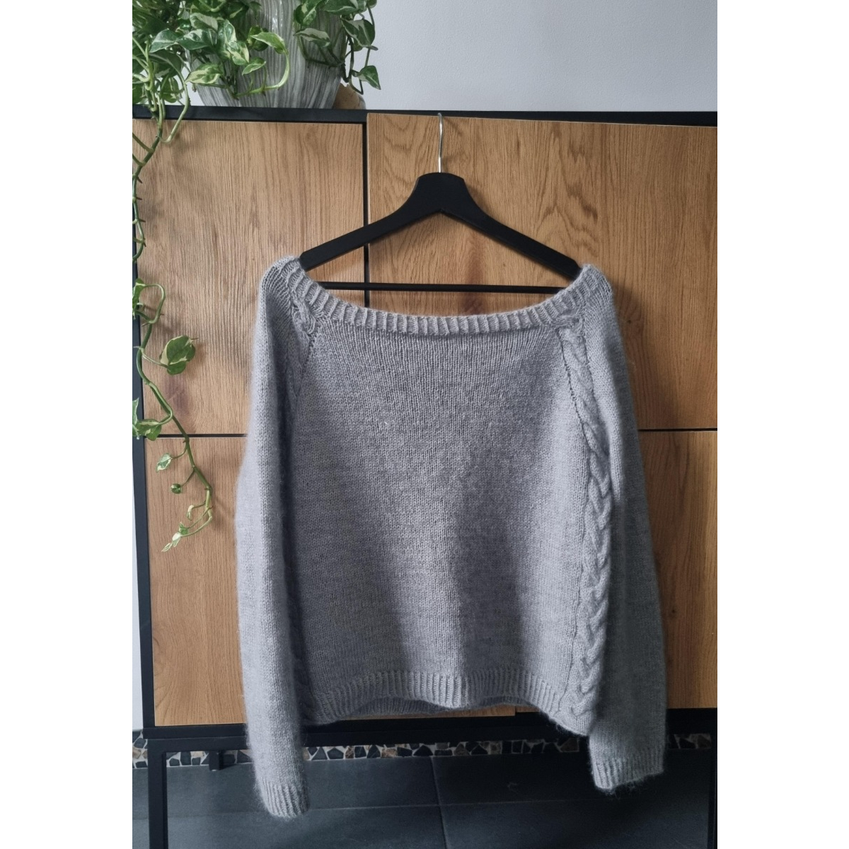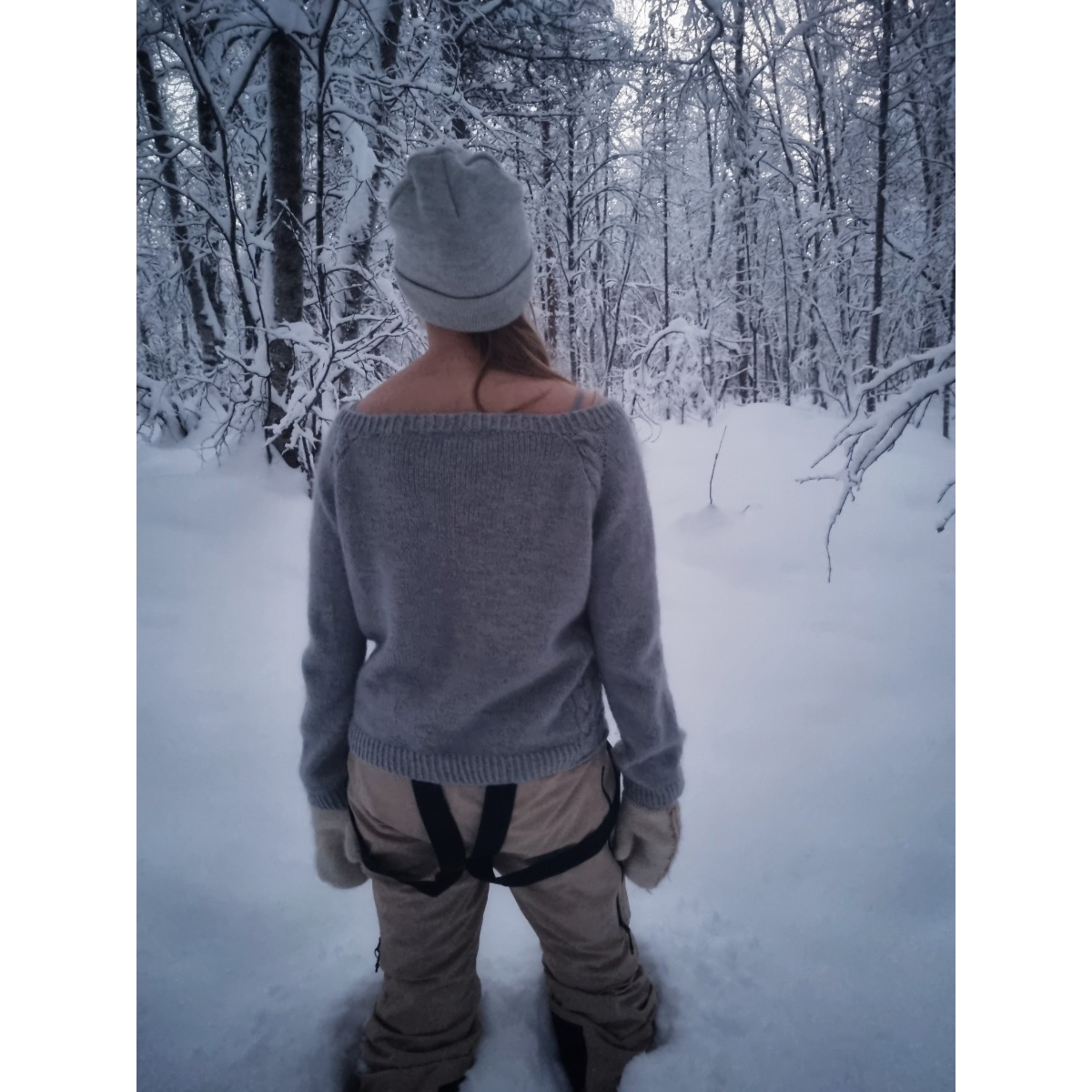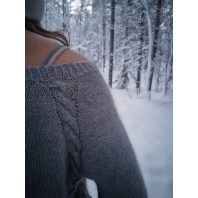 Ainoa is a relaxed top-down sweater worked in the round. Decorative vine motifs are worked between the raglan increases. The entire sweater is knitted holding a merino yarn together with a silk mohair yarn creating a luxuriously soft fabric. The vine motifs at the raglans merge under the arms to form two cables that run along the sides of the sweater from the underarm down to the hem. Knitting begins with the neck ribbing. The vine motifs and increases are then worked as the yoke is shaped. After completing the yoke the sleeves are separated and the body is worked in the round with the side cables. Finally the sleeves are knitted straight down and finished with ribbing.
