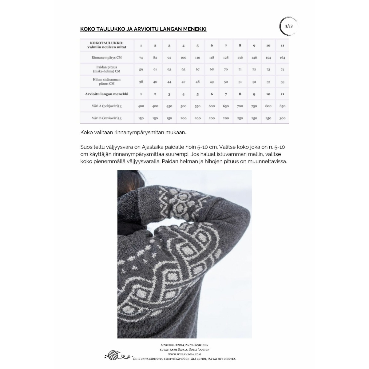 Suositeltu väljyysvara on Ajastaika paidalle noin 5-10 cm. Valitse koko joka on n. 5-10 cm käyttäjän rinnanympärysmittaa suurempi. Jos haluat istuvamman mallin, valitse koko pienemmällä väljyysvaralla. Paidan helman ja hihojen pituus on muunneltavissa.