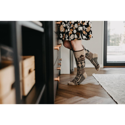 Koko: sukat on suunniteltu kahdelle eri pohkeen leveydelle (kapea n. 36 cm ja leveä n. 41 cm) sekä kahdelle eri jalkaterän pituudelle (38–39 ja 42–43). Sukat voidaan neuloa joko lyhyenä tai pitkänä versiona.