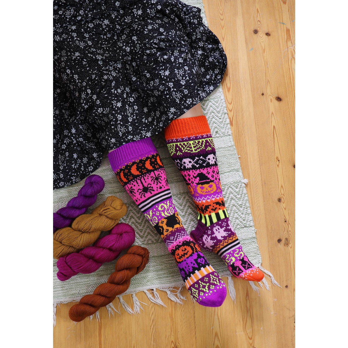 Jos sinuakin viehättää Halloween-henkiset aiheet ja värimaailma, tervetuloa neulomaan Elviiran Sukkia! Oli Halloween-sesonki, tahi ei, niin aina voi ujuttaa ripauksen hauskoja kummitusjuttuja elämään. Värimaailmaa vaihtamalla näistä saa muihinkin vuodenaikoihin sopivat ihanan karmivat yökyöpelin sukat. Leikittele väreillä ja pidä hauskaa, sillä näitä sukkia neuloessa ei pitäisi tylsistyä!