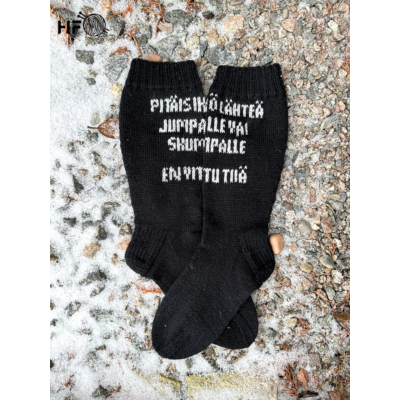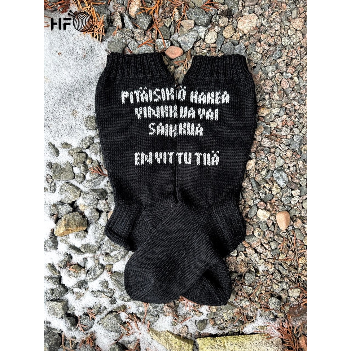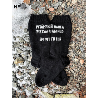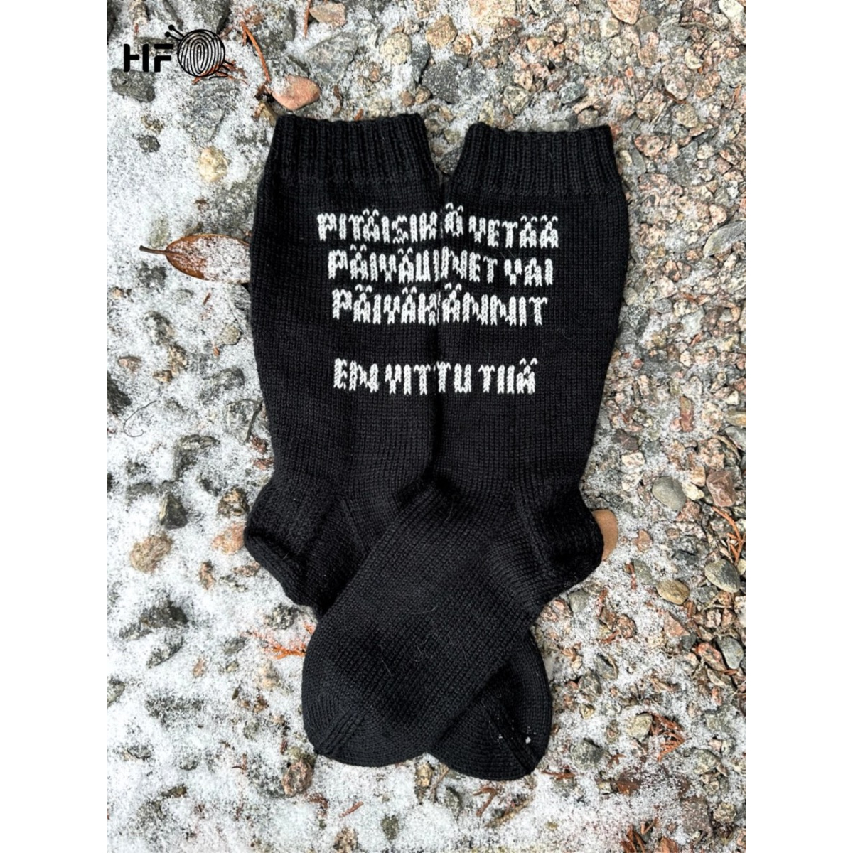 • Pääväri: Lankava Sulo, väri Salmiakki, tai mikä tahansa muu sopivan vahvuinen musta sukkalanka, jonka juoksevuus on 100 g / n. 400 m. Menekki kapeaan malliin noin 100 g ja leveämpään noin 120 g, riippuen jalkaterän pituudesta.