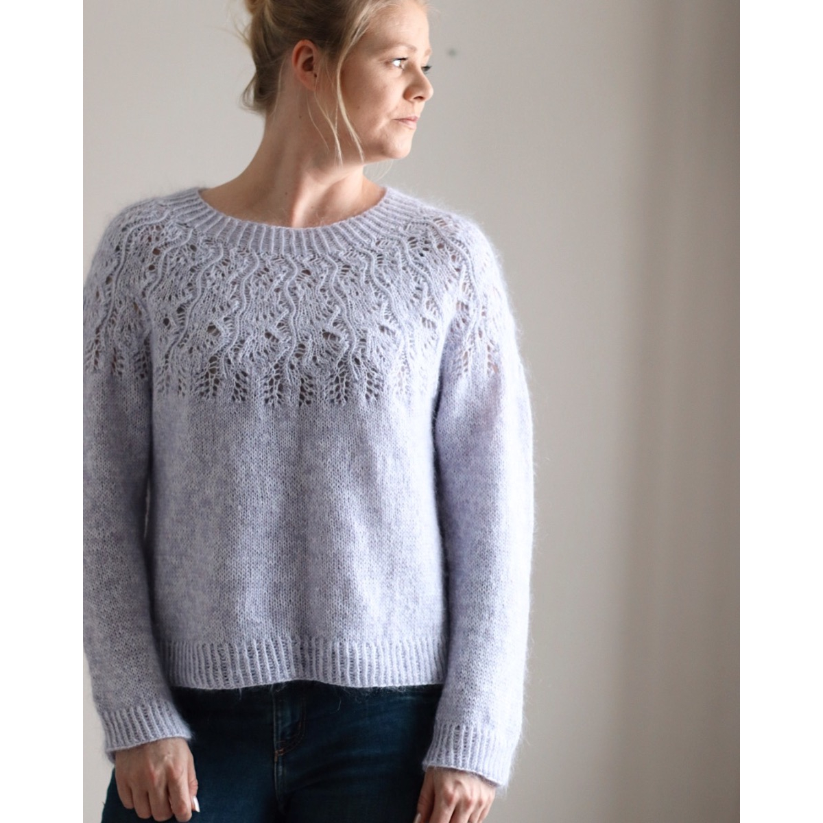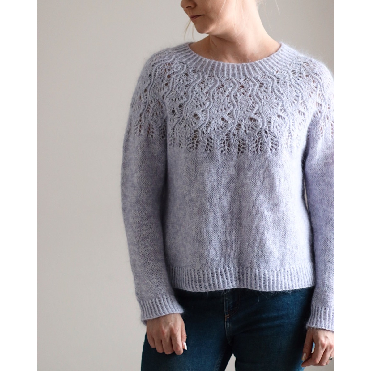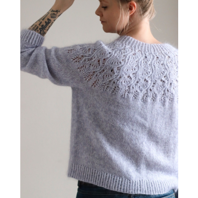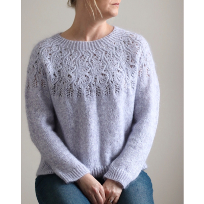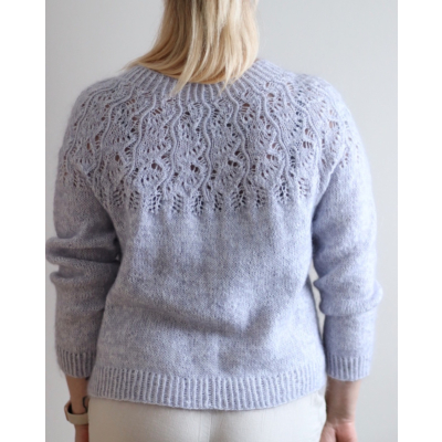 Jasmin-villapaita on pitsikaarroke ja neulotaan ylhäältä alaspäin kahdesta ohuesta langasta.