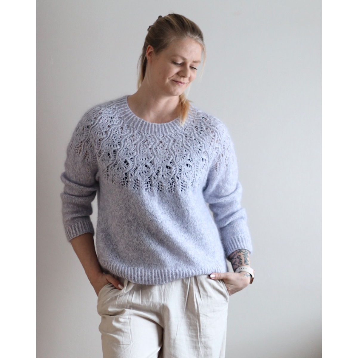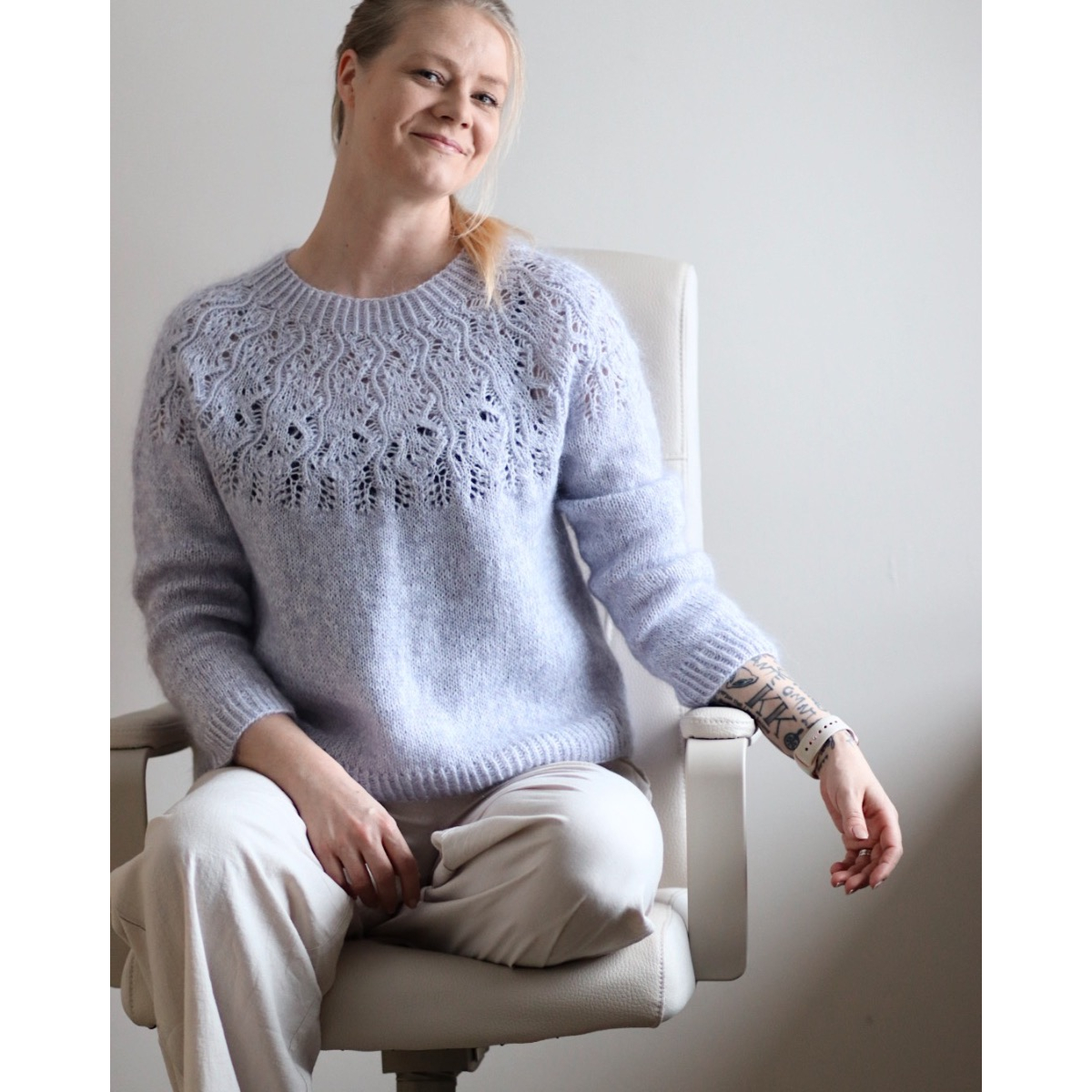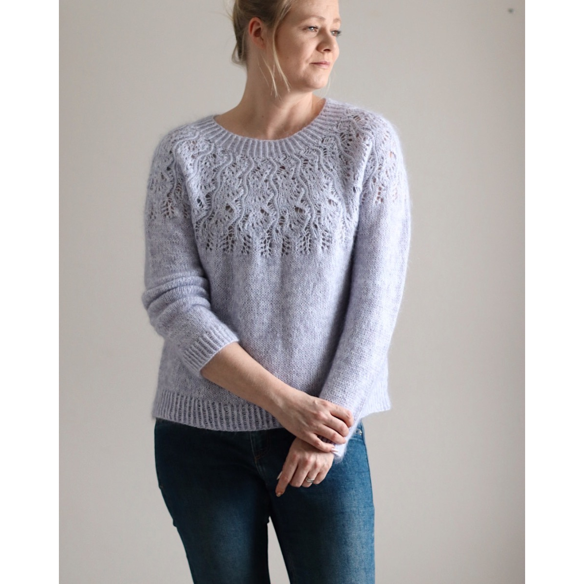 Jasmin-villapaita on pitsikaarroke ja neulotaan ylhäältä alaspäin kahdesta ohuesta langasta.
