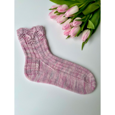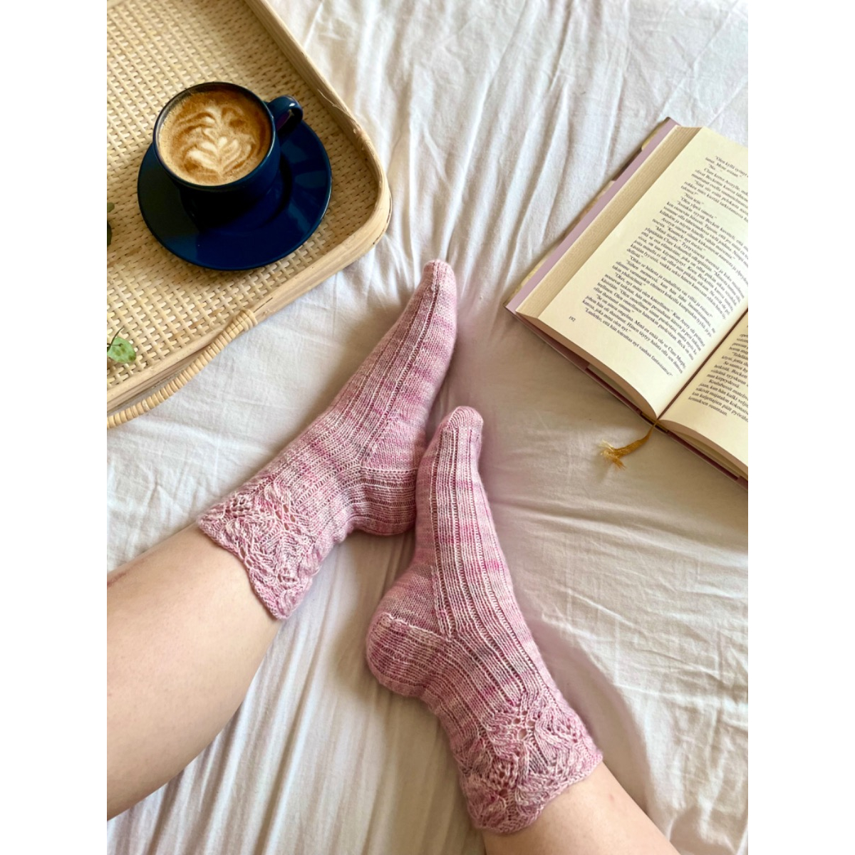 Lotus Lake -sukat neulotaan fingering-vahvuisella langalla varren kauniista pitsikuviosta aloittaen. Pitsikuvio vaihtuu resoriksi, joka jatkuu kantalapussa ja terän päällä kärkikavennuksiin asti. Tässä ohjeessa on vain yksi koko mutta vaihtamalla langan paksuutta tai puikkokokoa, saat enemmän kokovaihtoehtoja.