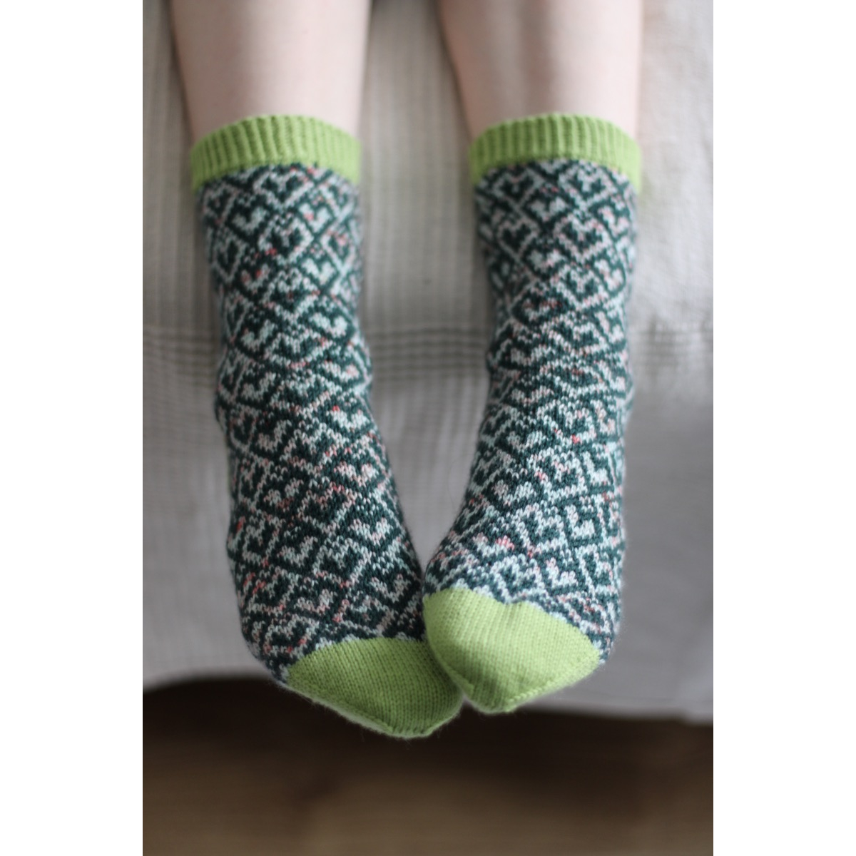 Lovespun sukat ovat täydellinen yhdistelmä kauneutta ja mukavuutta. Sukkien sydänkuvio saa inspiraationsa perinteisestä kudontamallista ja se sopii lyhyiden langanjuoksujensa ansiosta myös aloitteleville kirjoneulojille.