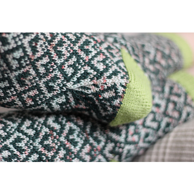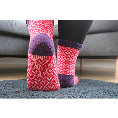 Sukat neulotaan ylhäältä alaspäin ja niissä on vahvistettu ranskalainen kantapää sekä kantapään alle sijoittuvat kiilakavennukset, jotka tuovat mukanaan kauniin pienen yksityiskohdan. Sukissa on käytetty kolmea väriä, mutta voit halutessasi neuloa korostevärin sijasta varren, kantapään ja kärjen myös toisella kuvioväreistä.