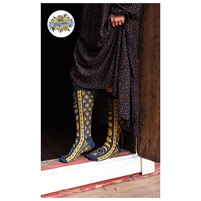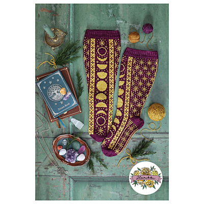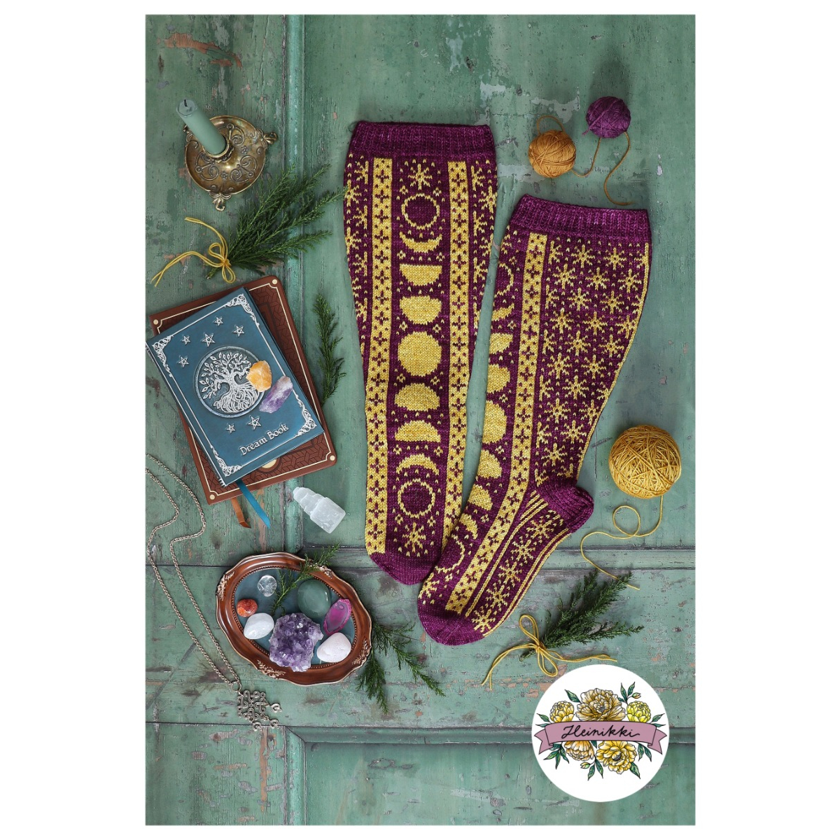 Lunar-sukat neulotaan kirjoneuleena ohuesta, fingering-vahvuisesta sukkalangasta. 15-sivuinen PDF-ohje sisältää hyvät kaaviokuvat ja selkeät sanalliset ohjeet kahdelle eri leveydelle.