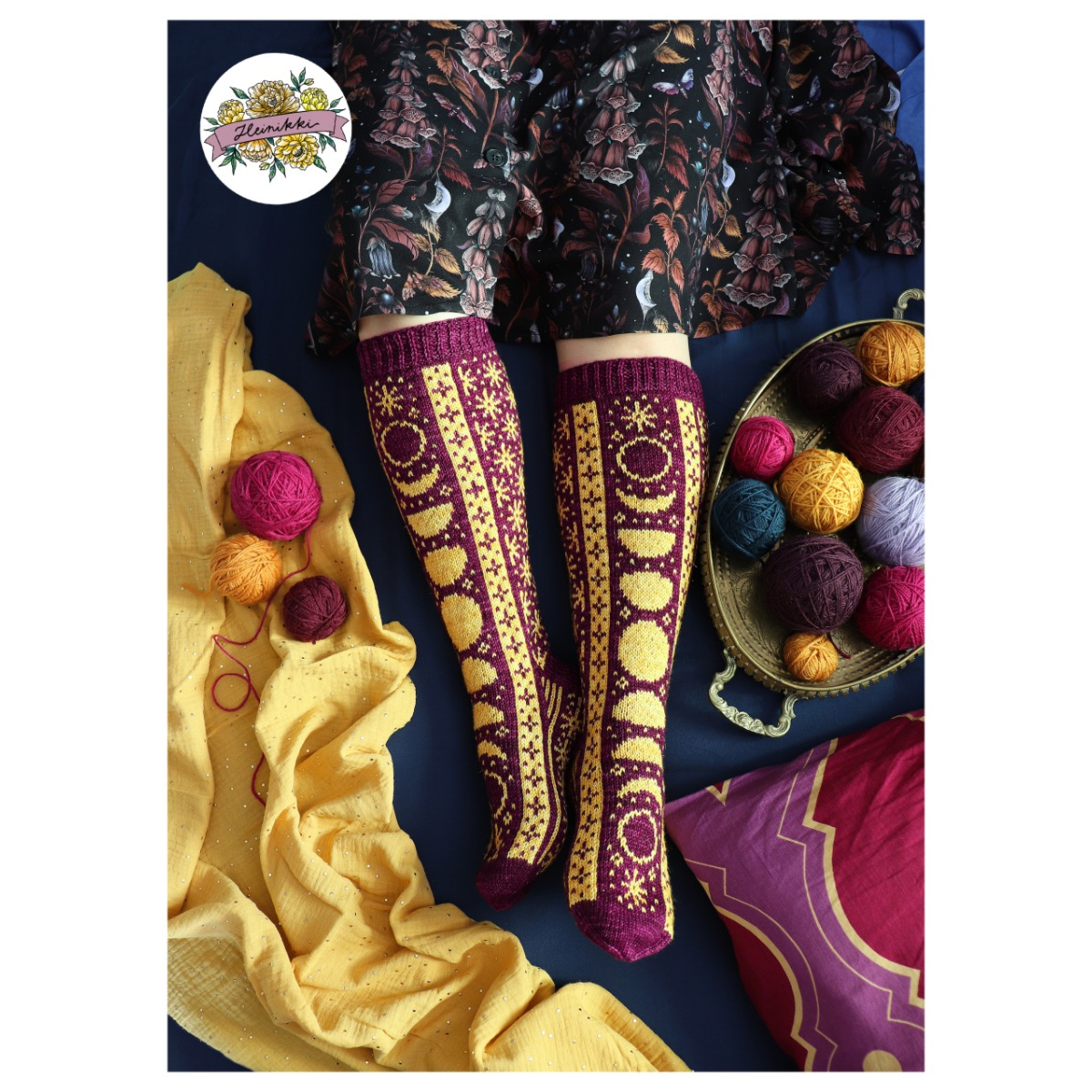 Lunar-malli julkaistiin ensimmäisen kerran syksyllä 2023 kirjassa Villasukkabuffet - Toinen kattaus. Kuun eri vaiheita kuvaavat sukat olivat olleet mielessäni pidemmän aikaa, koska aihe on itselleni rakas ja mielestäni kiinnostava. Alati muuntautuvan Kuun lumoava valovoima on hurmannut minut ja en kyllästy sen katselemiseen koskaan. Lunar-sukissa varren etuosaan on kuvattu Kuun säännölliset vaiheet uusikuusta puolikuun kautta täysikuuhun, jonka jälkeen kuun vaiheet alkavat taas vähentyä kohti uudenkuun aikaa.