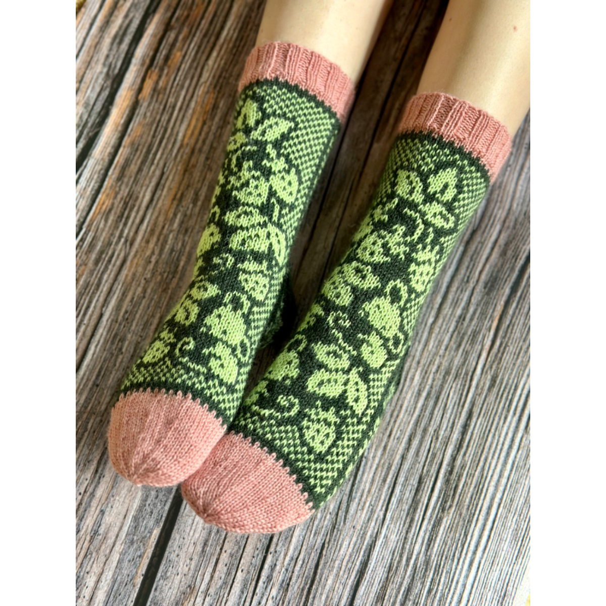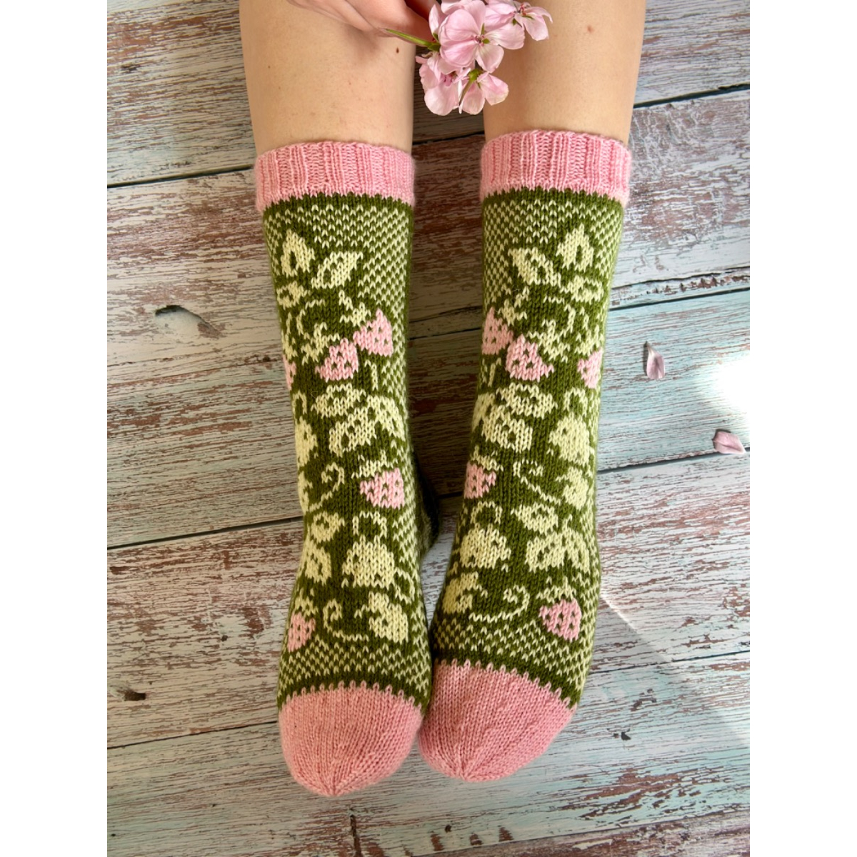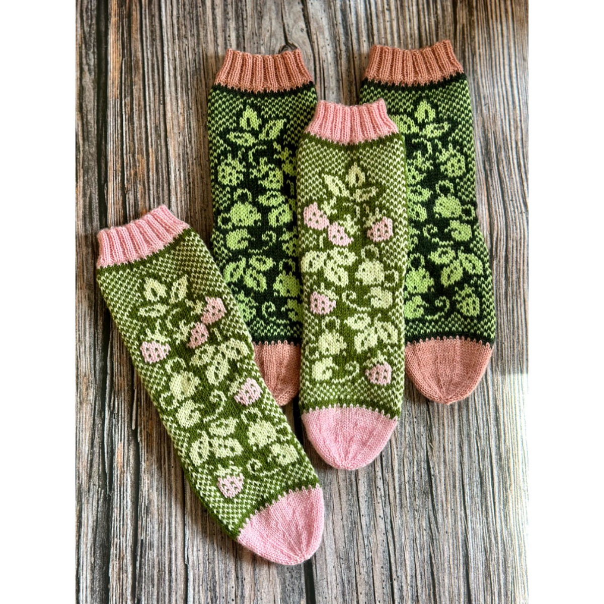 Mansikkavarkaat-sukissa on vahvistettu hollantilainen kantapää ja kärjessä sädekavennukset. Työ neulotaan kahden värin kirjoneuleena, joskin mansikat tulevat kivasti esiin, mikäli niihin lisätään hieman punaa jälkikäteen silmukoita jäljentämällä. Sukan leveys on sama joka koossa, mutta varren voi tarvittaessa neuloa isommilla puikoilla kuin terän, jolloin se istuu varmasti tuhdimpaankin nilkkaan.