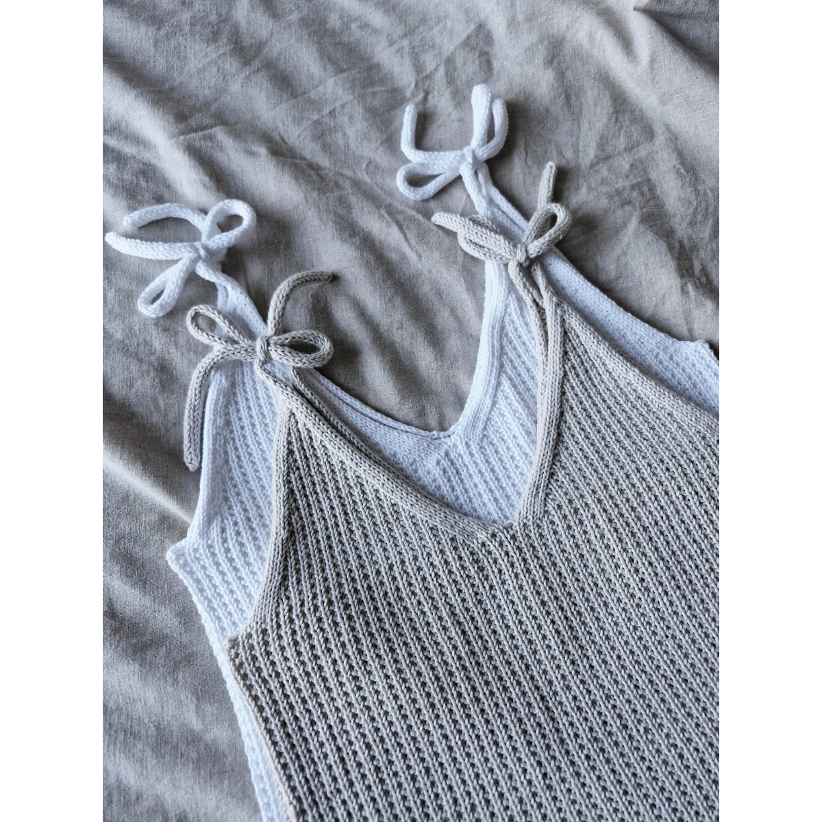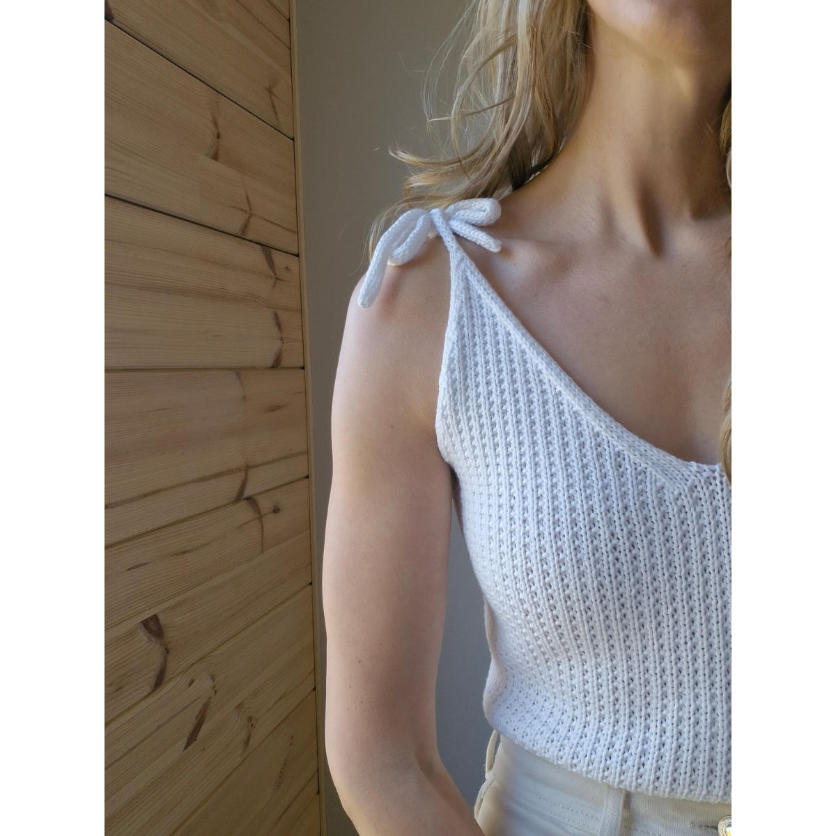 Toppi neulotaan pyöröneuleena alhaalta ylös kädenteille asti. Tämän jälkeen työ jaetaan neljään osaan ja olkaimet neulotaan erikseen muotoillen samalla v-pääntie. Olkaimet neulotaan i-cord -nyörinä. Mallitopit on neulottu Drops Belle -pellavasekoitelangasta. Korvaavaksi langaksi käyvät dk-vahvuiset (50 g = 100–130 m) kesälangat. Lankavalinnalla voit helposti muuttaa neuletopin yleisilmettä.