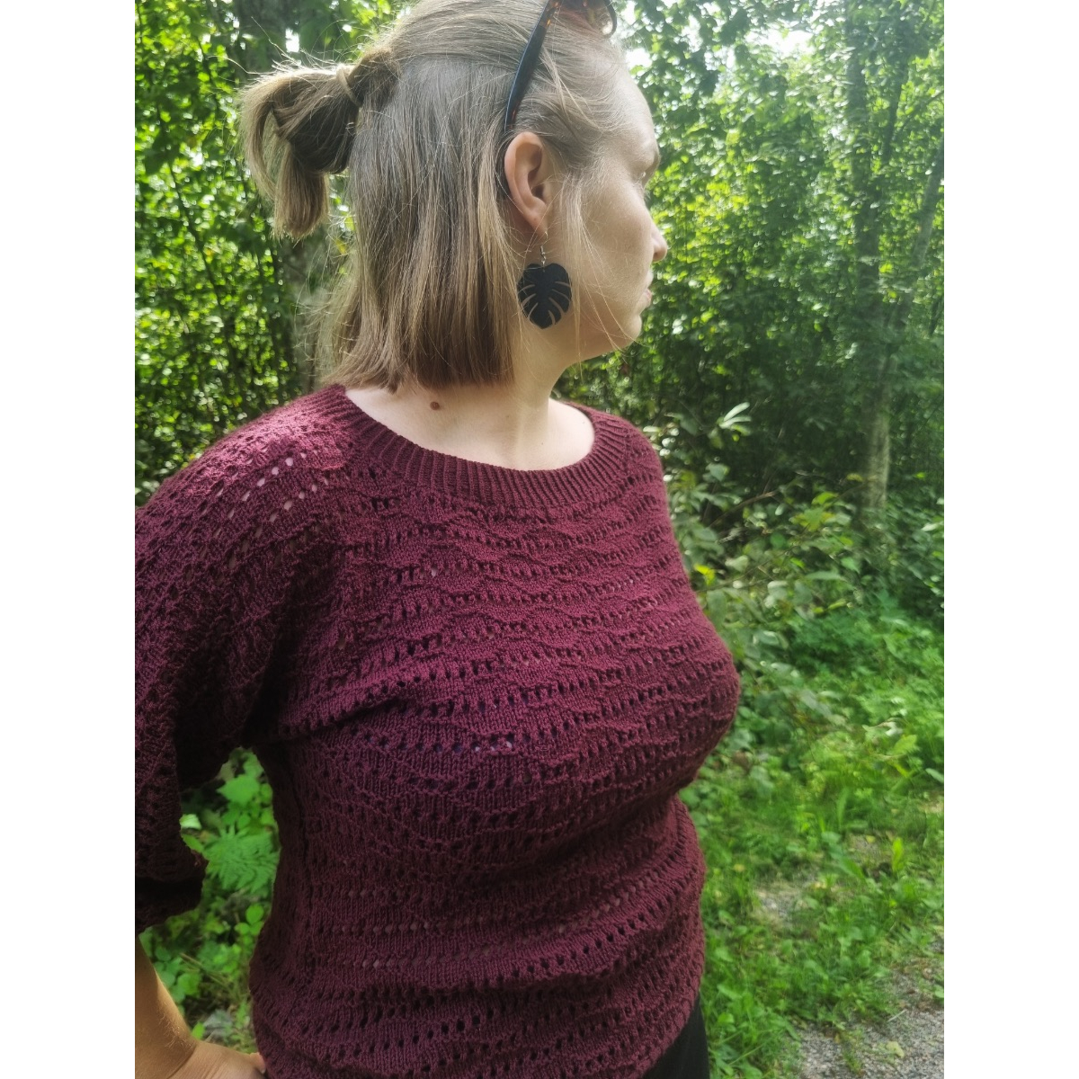 Olivy is a loose-fitting sweater with ¾ sleeves and lace detail, worked in one piece without shoulder seams. The work begins at the front hem and is knitted up to the underarms, where the sleeves are added. During shaping the neckline, the work is divided into two sections until the back stitches are joined at the neck. The sweater then continues down the back to the hem. Finally, the sides are seamed together from the sleeves down to the hem, and ribbing is added to the neckline, sleeves, and hem.