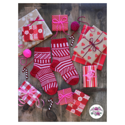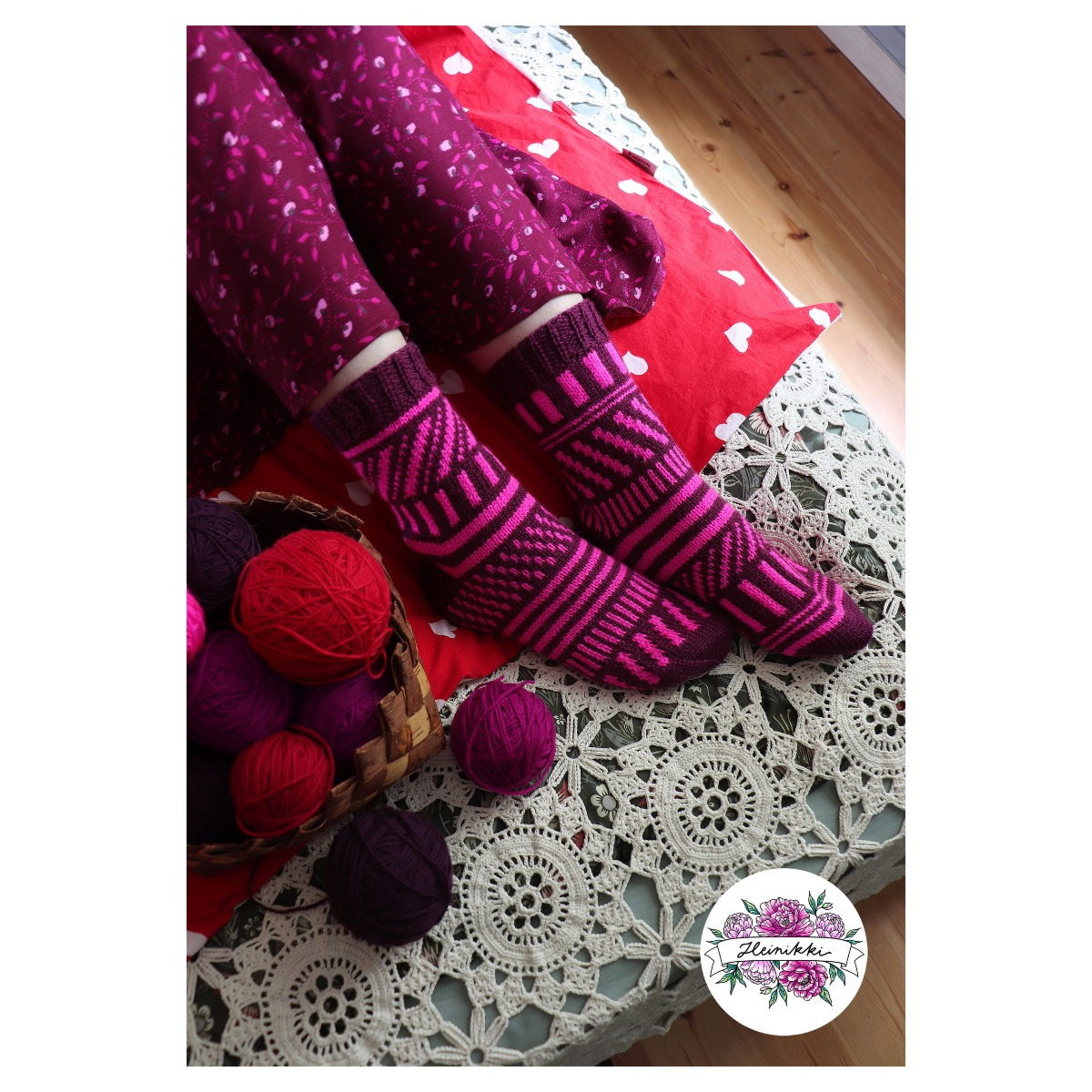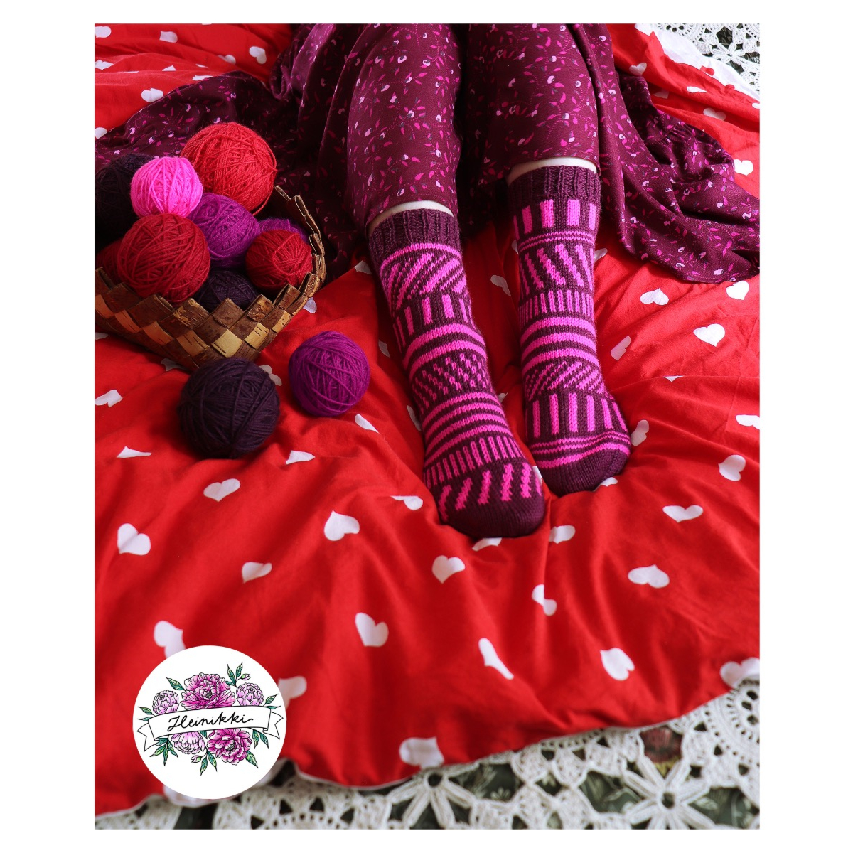 Näiden sukkien inspiraation aiheet on helppo päätellä. Arvaat varmaan, että Heini tykkää raitakuoseista, erityisesti vinoraidoista, sekä Polkka-karkeista ja jouluisista karkkikepeistä. Punaisen sävyillä näistä saa hyvinkin jouluiset sukat ja värejä vaihtelemalla sukat sopivat mainiosti muihinkin sesonkeihin.