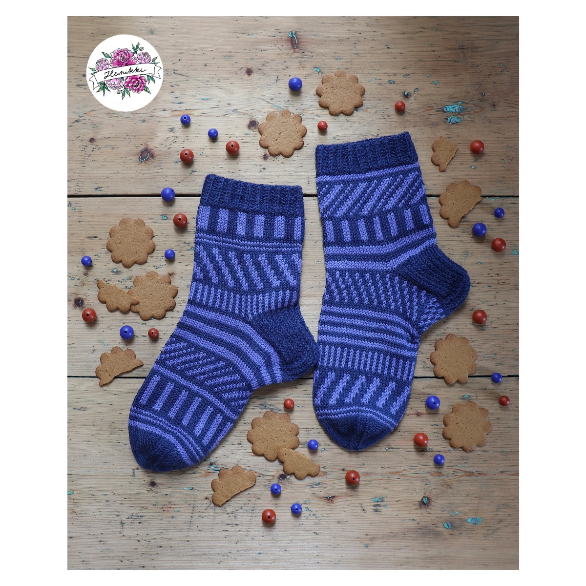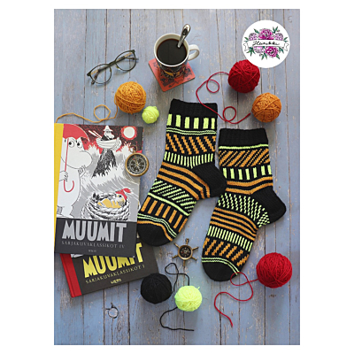 Lyhytvartiset Polkka-sukat neulotaan kirjoneuleena keskipaksusta sukkalangasta. 17-sivuinen PDF-ohje sisältää hyvät kaaviokuvat ja sanalliset ohjeet sekä naisen, että miehen sukkaan. Jalkaterän kaaviosta löytyy muutamia eri kokovaihtoehtoja.