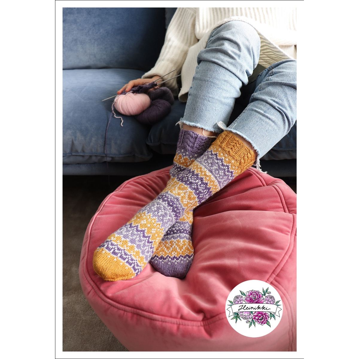 Runotytön sukkien 11-sivuinen PDF-ohjelehtinen sisältää hyvät kaaviokuvat ja sanalliset ohjeet kauniisiin kirjoneulesukkiin: