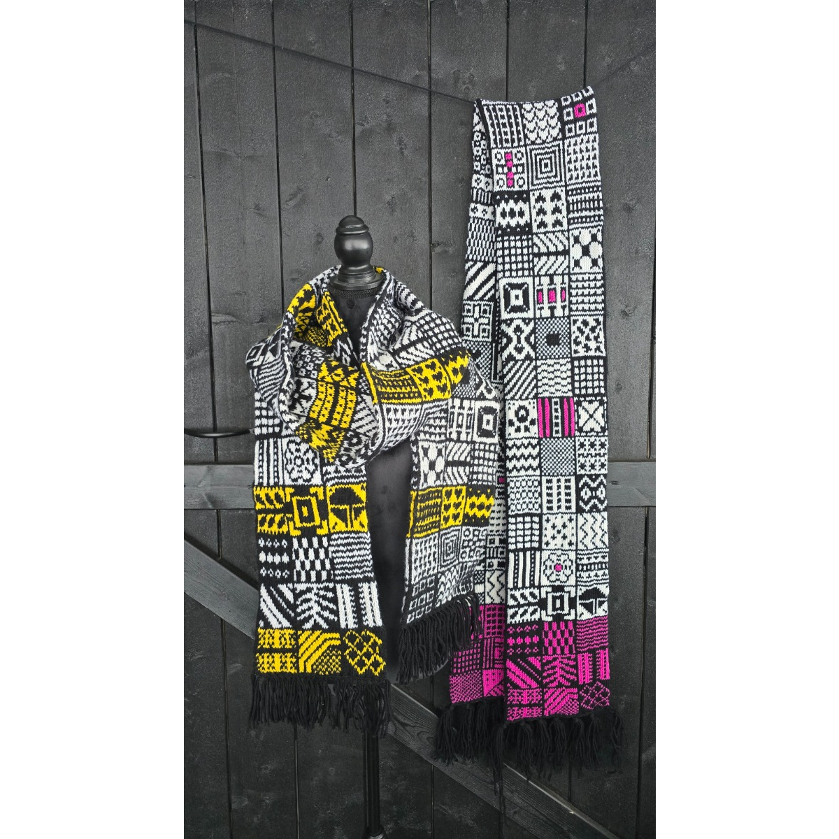 Tämä muhkea ja lämmin kirjoneulekaulahuivi on neulottu pyöröpuikoilla. Sen pituuteen voi vaikuttaa neulomillaan ruutukerrosten määrällä ja leveyteen lankavalinnalla. Myös puikkovalinta vaikuttaa huivin kokoon. Kaaviot ovat mustavalkoiset, joten omilla lempiväreillä neulominen onnistuu vaivatta.