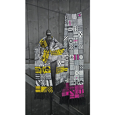 huomaat kaulahuivien kuvista, molemmissa on käytetty mustan ja valkoisen lisäksi tehosteväriä hieman eri lailla. Saat kaulahuivista uniikin, kun käytät tehostevärejä kuten itse haluat, eli värittele ruutuja oman mielikuvituksen mukaan vaikka erivärisillä jämälangoilla.