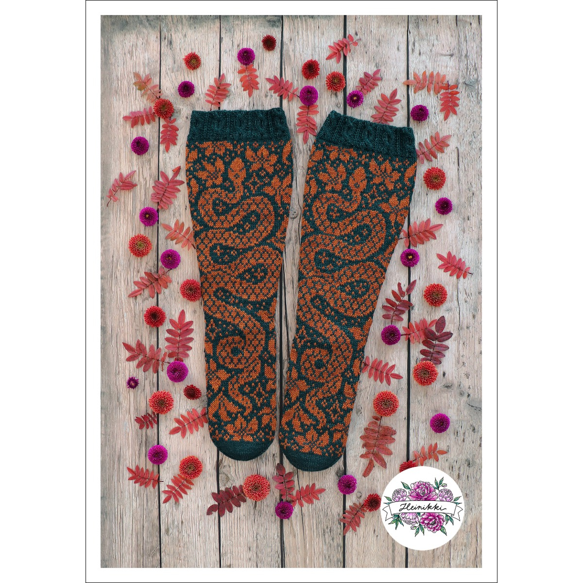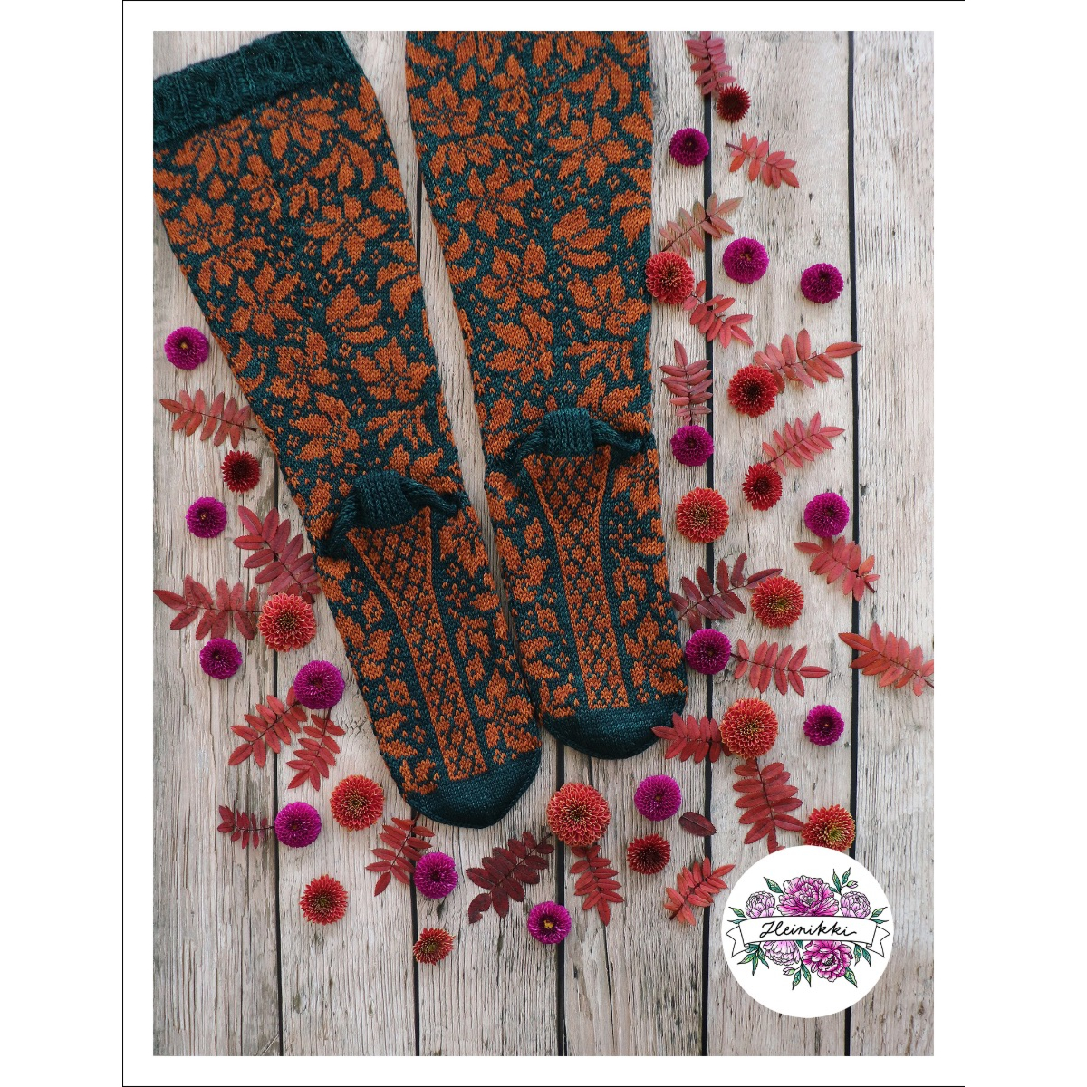 Pitkävartiset sukat neulotaan kirjoneuleena ohuesta, fingering-vahvuisesta sukkalangasta. 15-sivuinen PDF-ohje sisältää hyvät kaaviokuvat ja sanalliset ohjeet kirjoneulesukkien kahteen eri leveyteen.