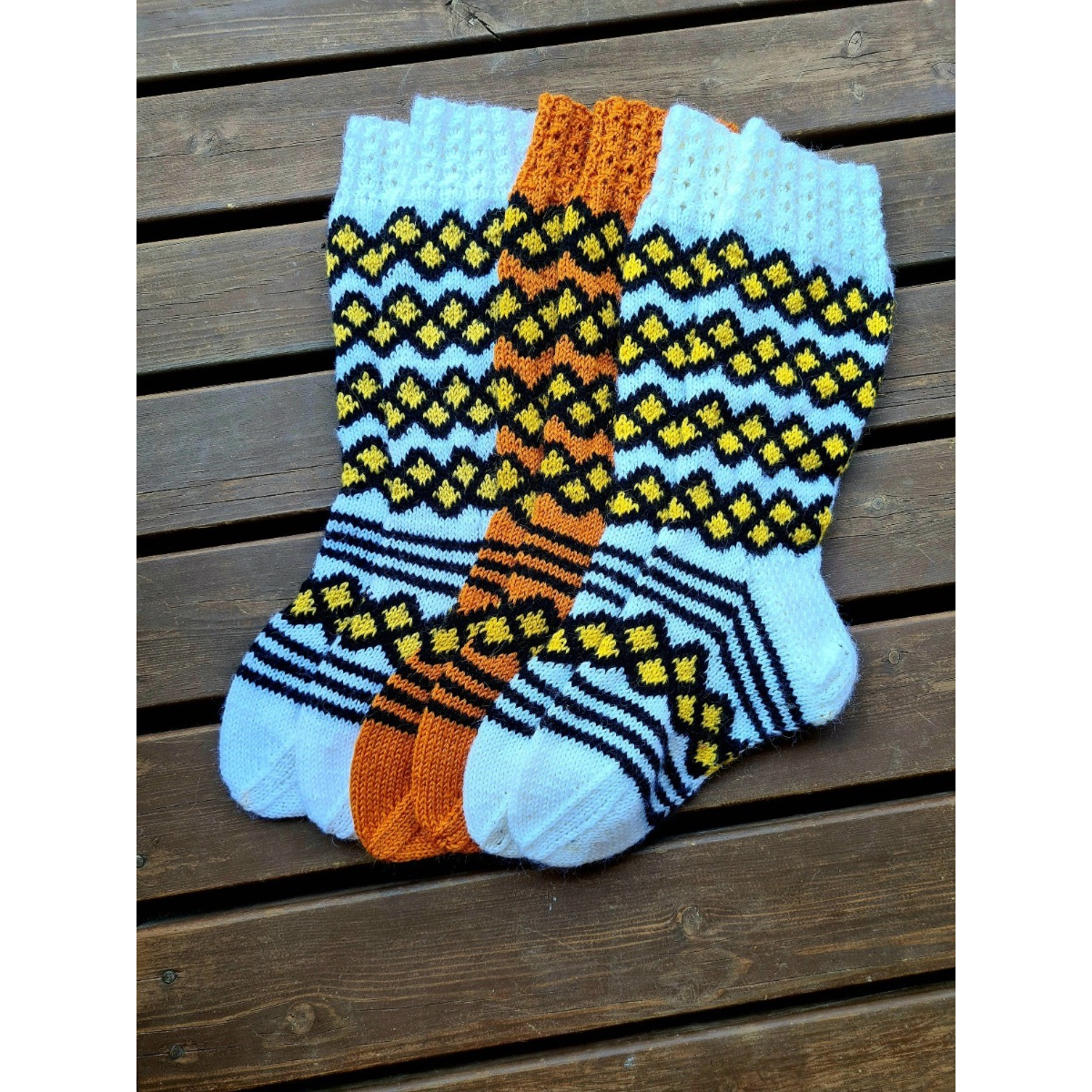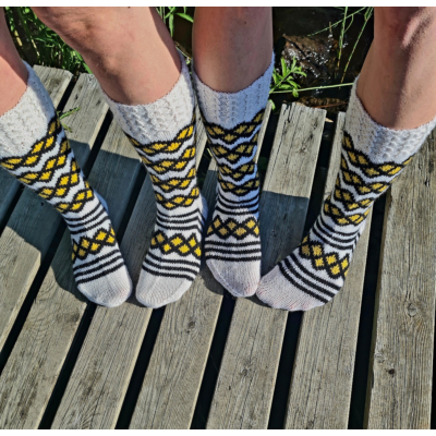 Solja-kirjoneulesukat neulotaan keskipaksusta langasta. Jalkaterä on helposti muokattavissa eri kokoihin.