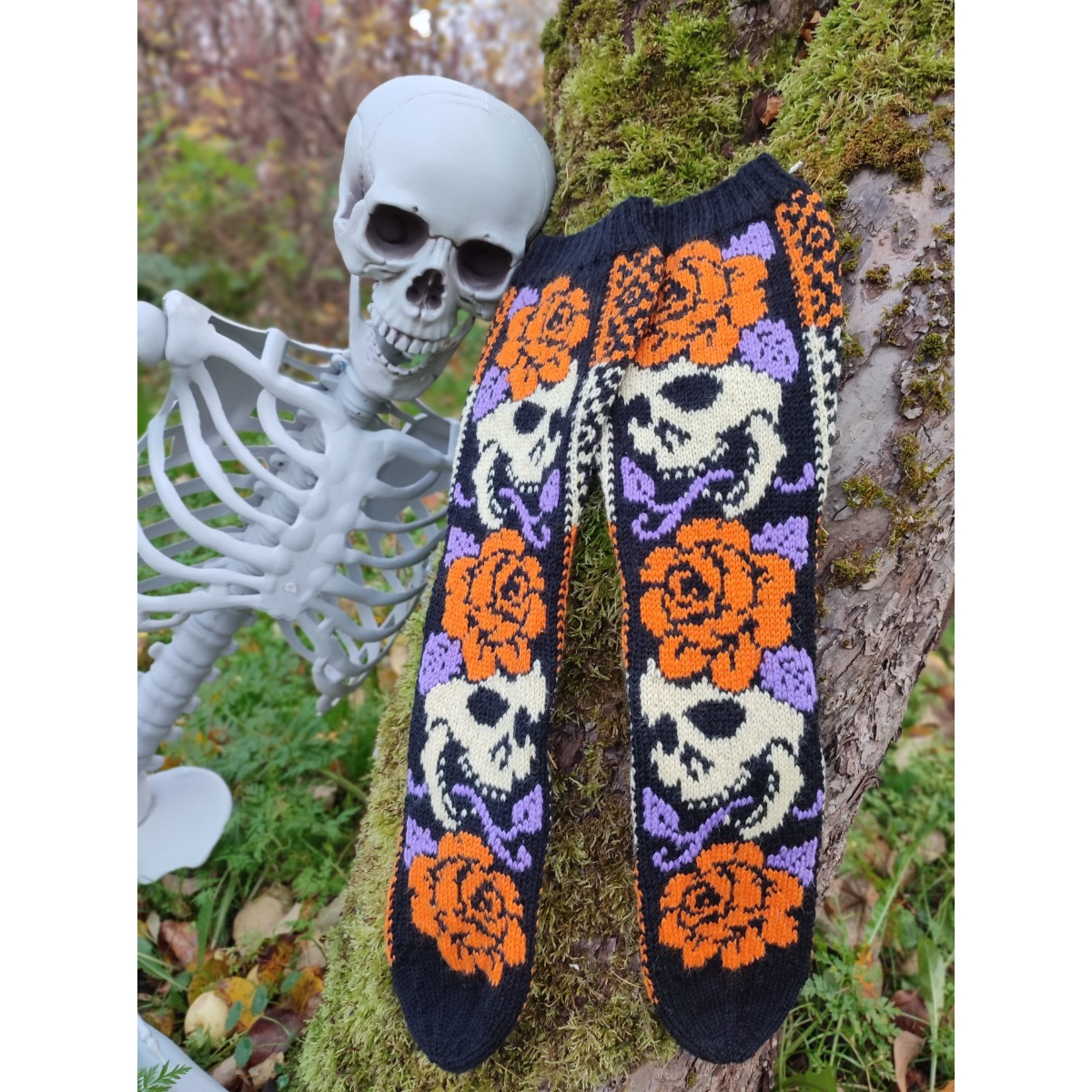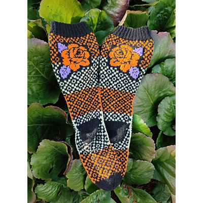 The Still Laughing socks are knitted on five double-pointed needles from the cuff down. The pattern incorporates a reinforced French heel and a round toe. You can choose from two different widths for the calf or knit a mid-calf version with no shaping. The socks are knitted in stranded knitting with two colors per row and the extra colors are worked in duplicate stitch at the end. If you wish to take the easy way, you can knit the socks with just two colors and forget about the duplicate stitching.