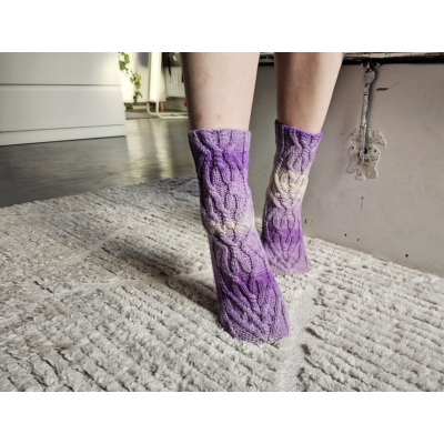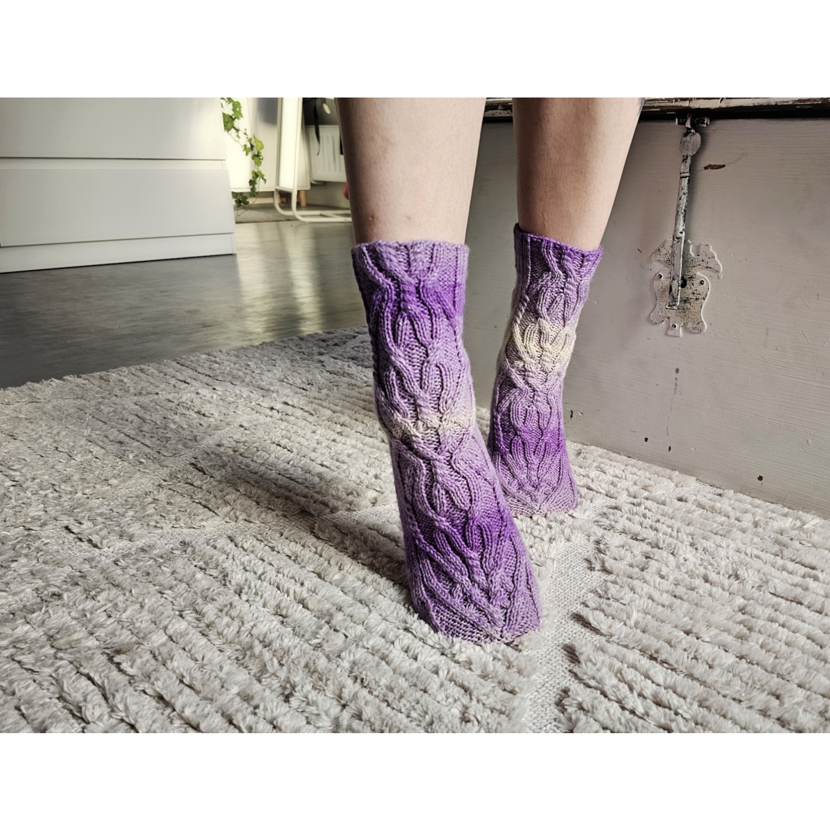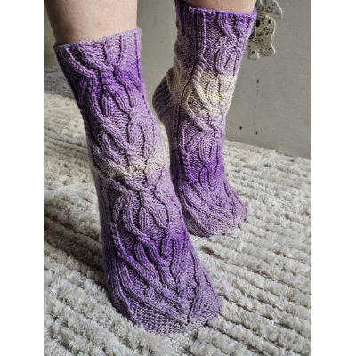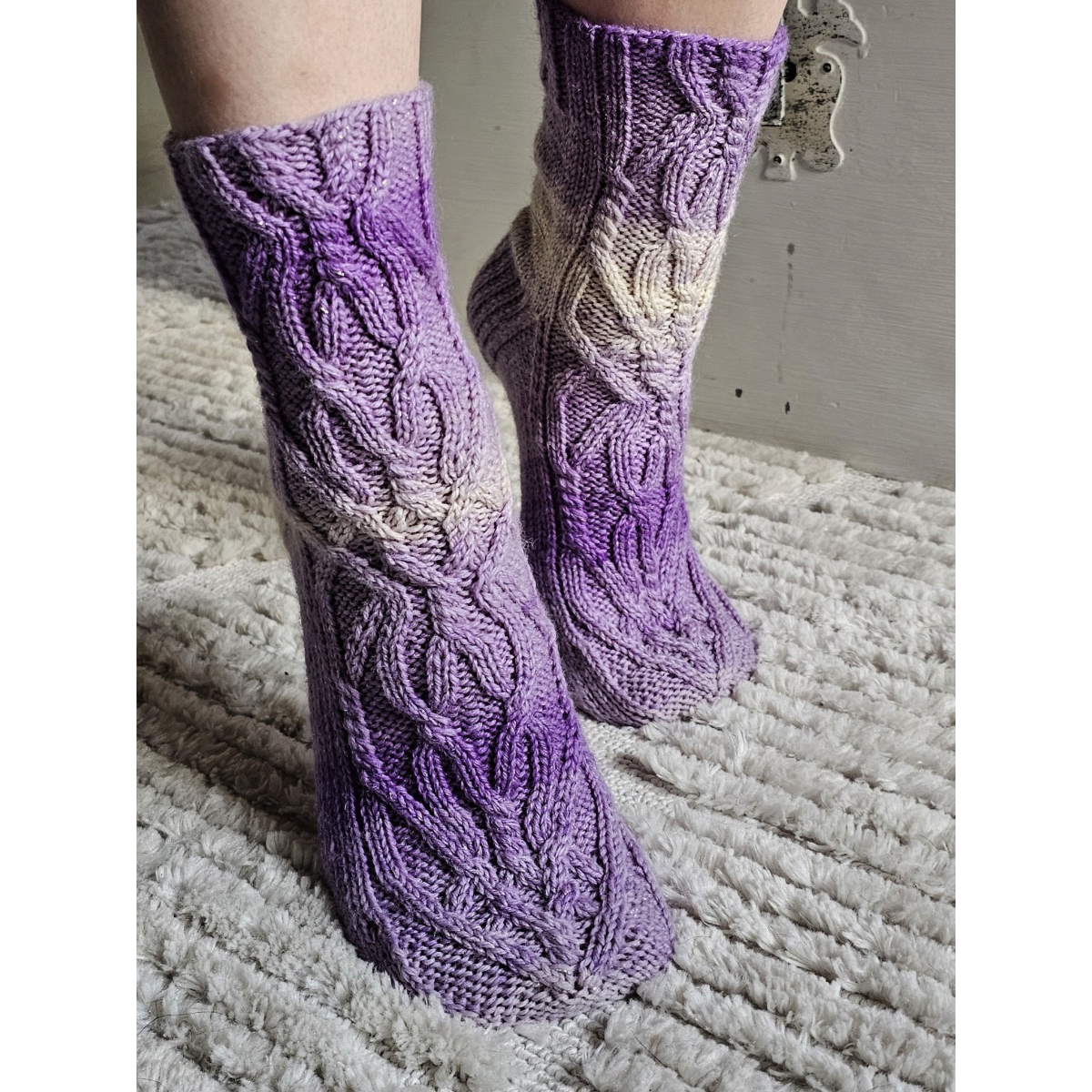 Ursula-sukat on Hannin ensimmäinen pintaneuleohje. Sukat neulotaan varresta alaspäin. Kantapää on vahvistettu, ja kärkeen tehdään leveä nauhakavennus.