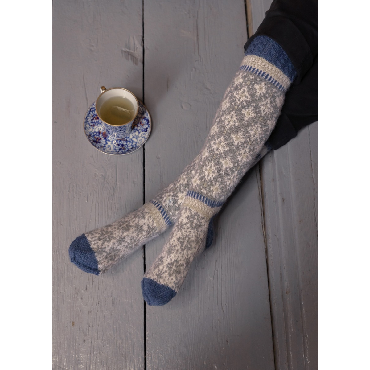 Jaana Huhtasen Villasukkia ja värssyjä -sarjaan kuuluvat Lumihiutale polvisukat ovat kirjoneuletta ja neulotaan varresta varpaisiin.