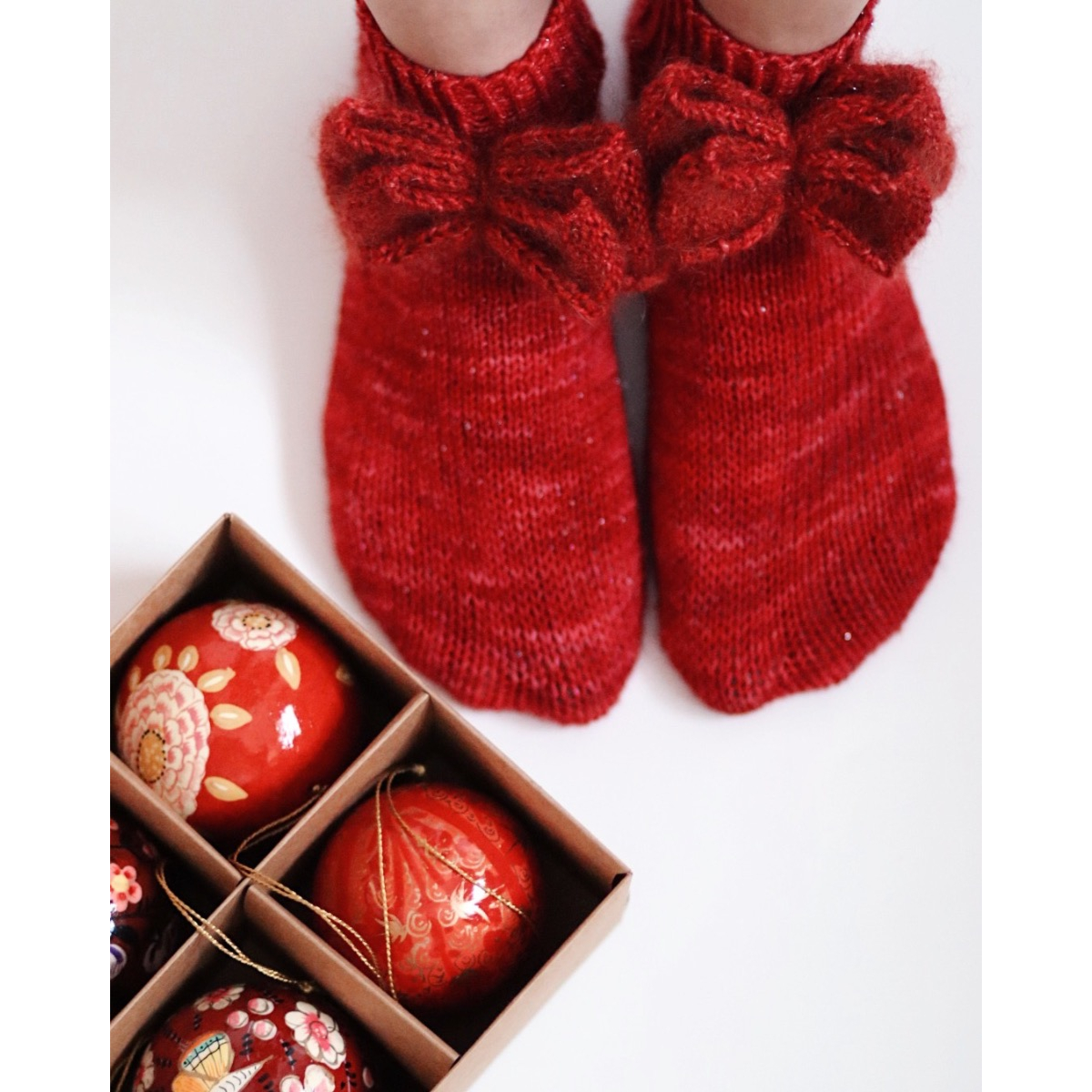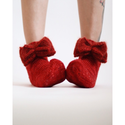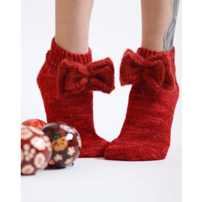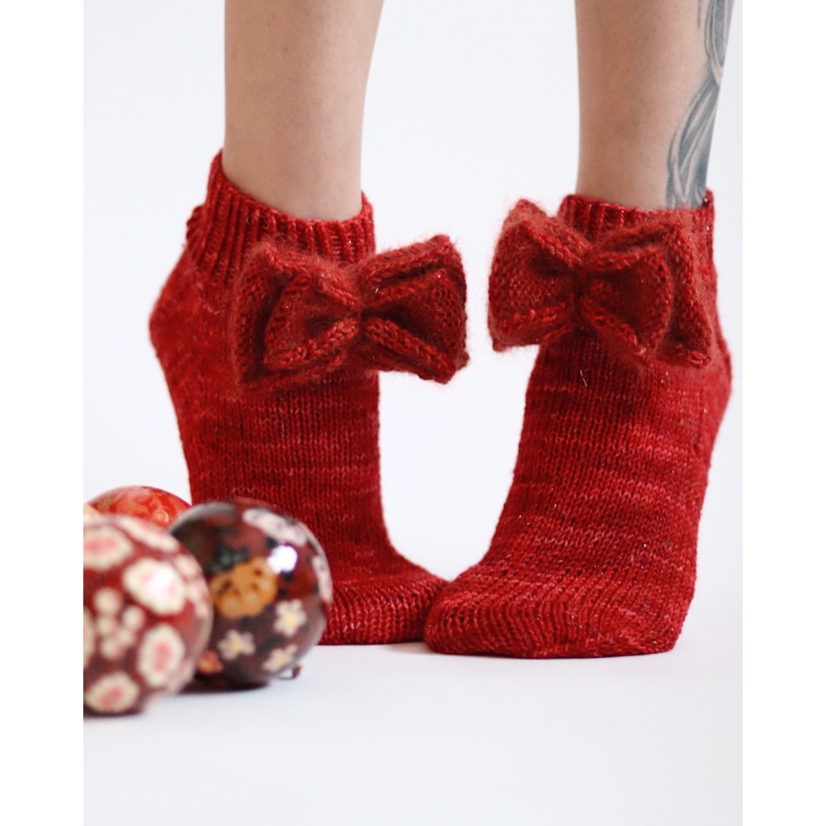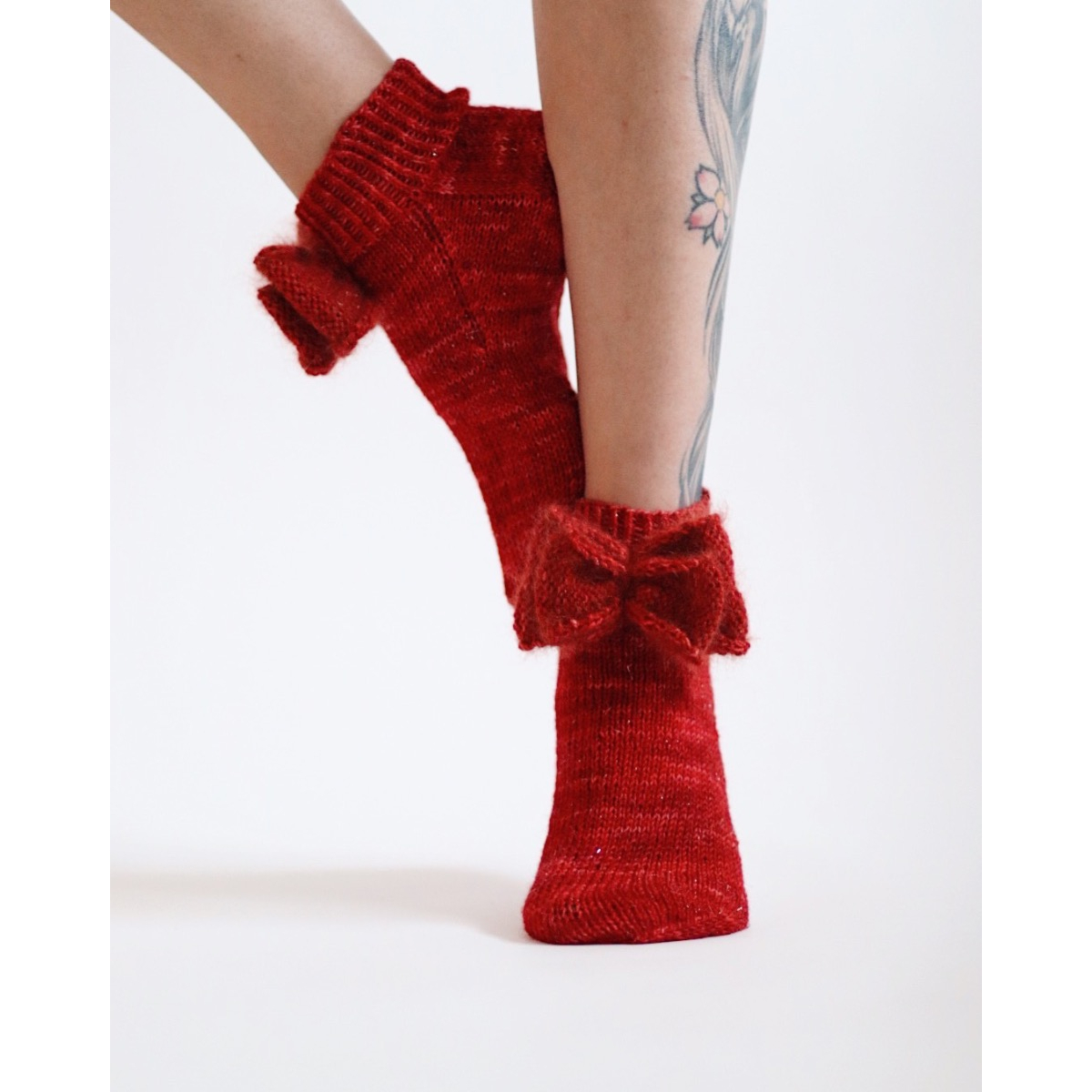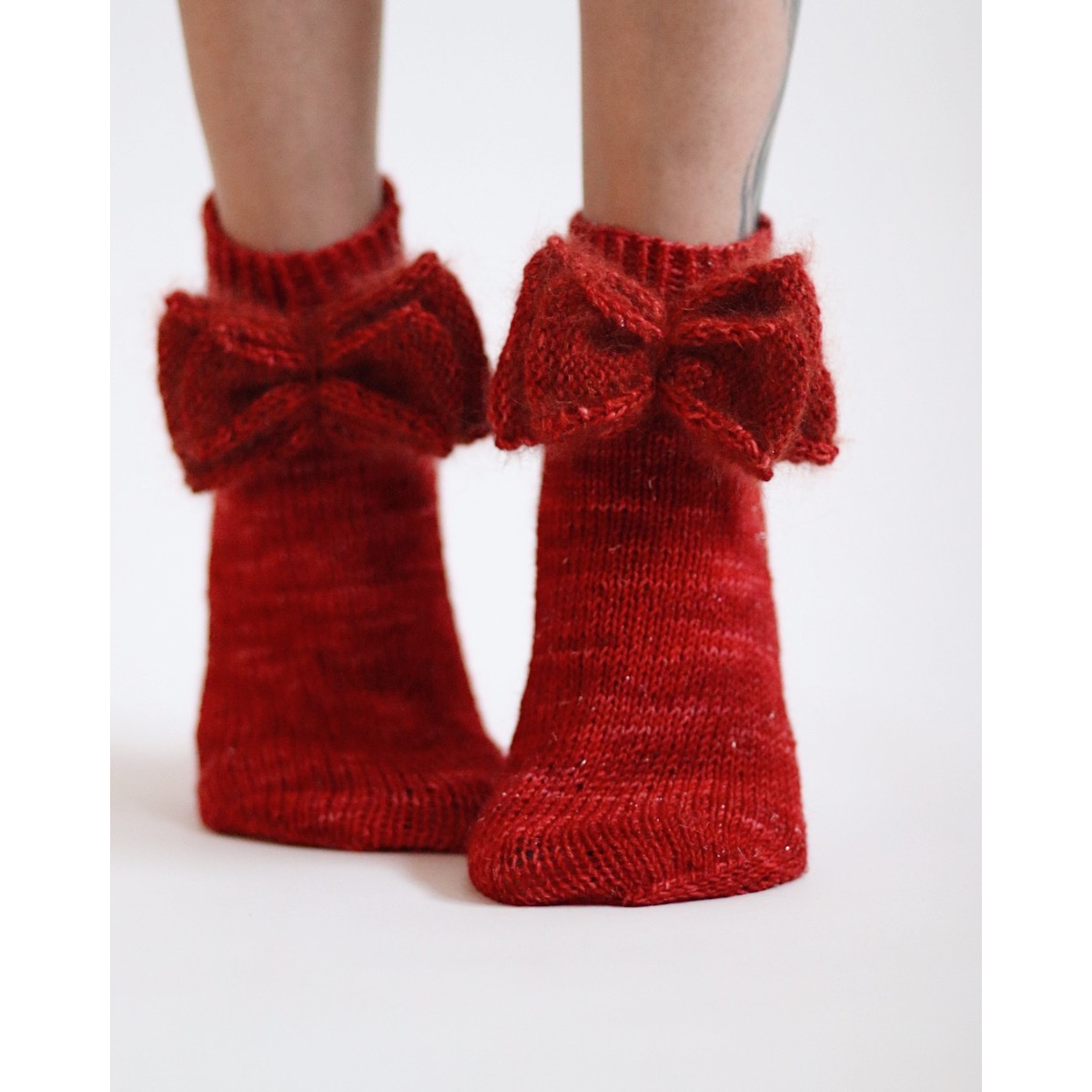 WowBow-sukat neulotaan varresta varpaisiin, sukan rusetit neulotaan erikseen. Voit käyttää rusettia myös hiuspinnissä tai pampulassa.