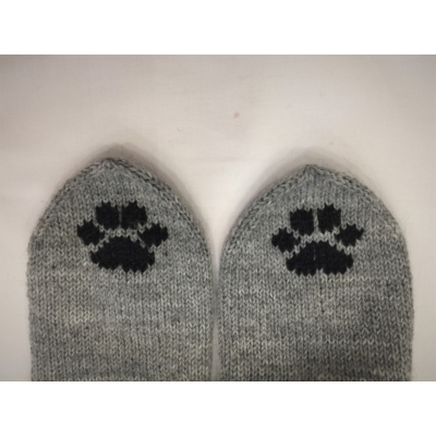 These socks are made with medium weight machine washable sock yarn, and the base colour is always medium grey. The picture is hand stitched onto the sock.