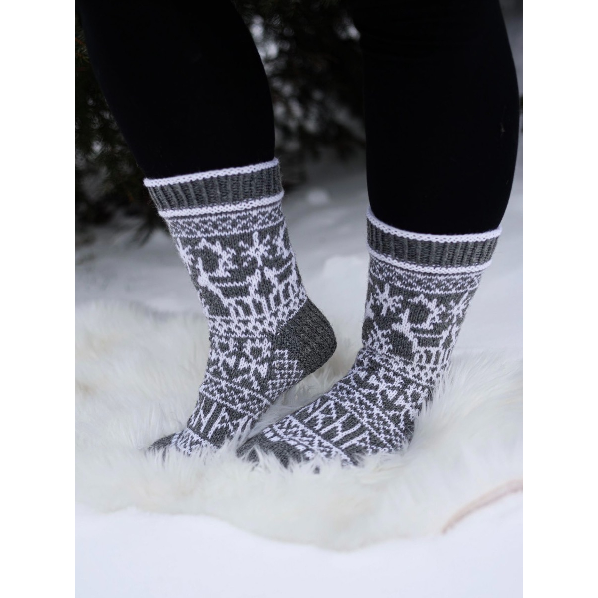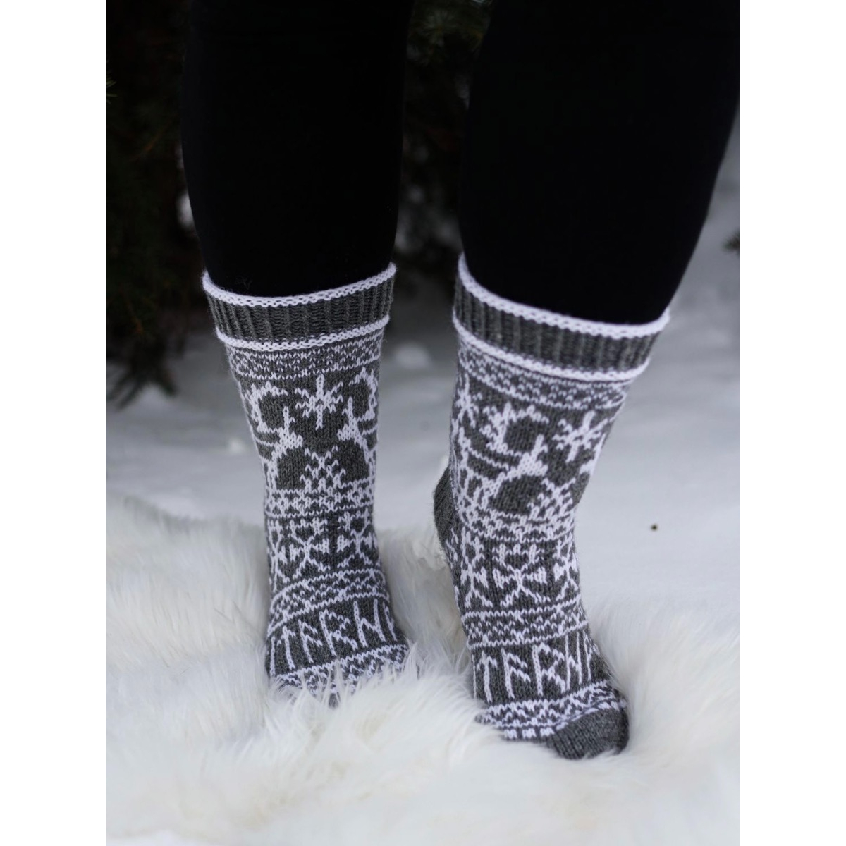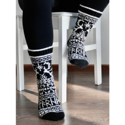 These socks were inspired by symbols used in shaman drums. They are made with thick machine washable sock yarn and available in multiple colours. There's also a knee length version of this design available.