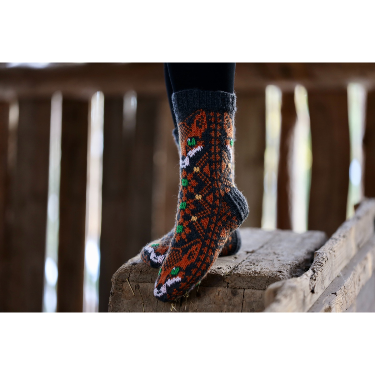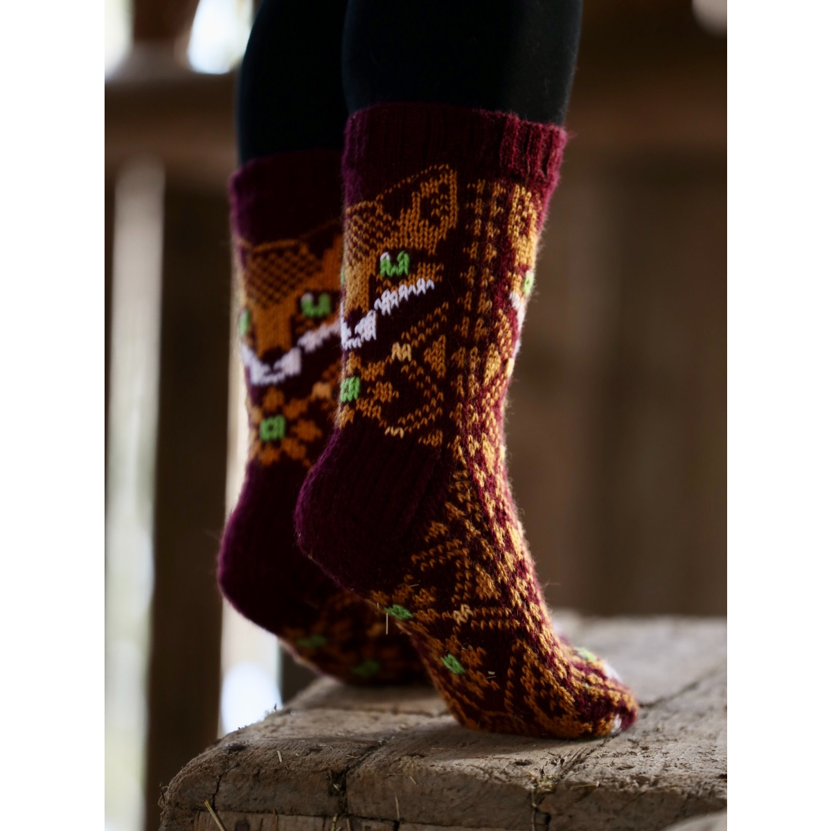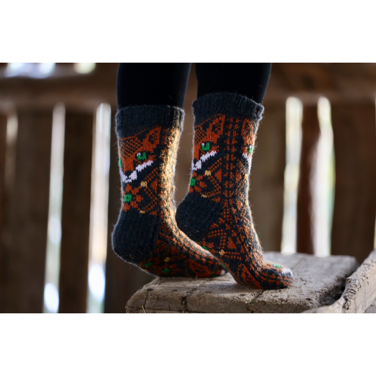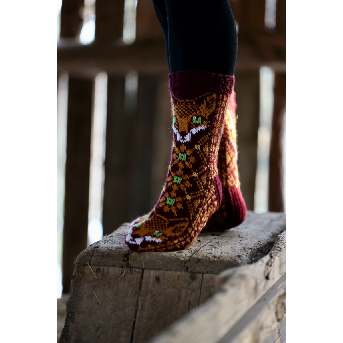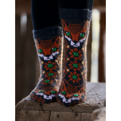 The Magical Fox Socks are made with medium weight machine washable sock yarn, and they come in two colours. The fine details are hand stiched onto the sock. There's also a knee length version of the same design, available in two calf sizes.