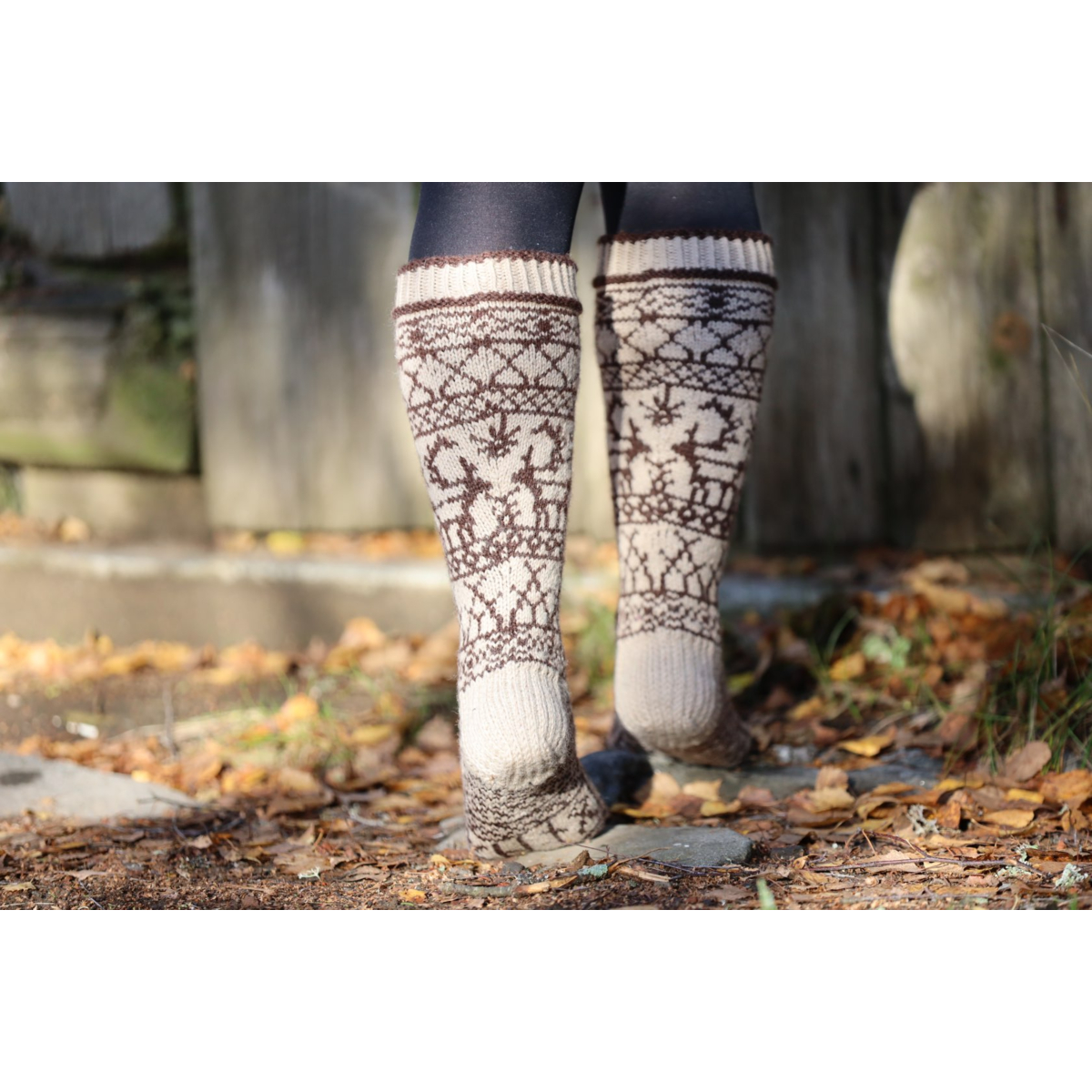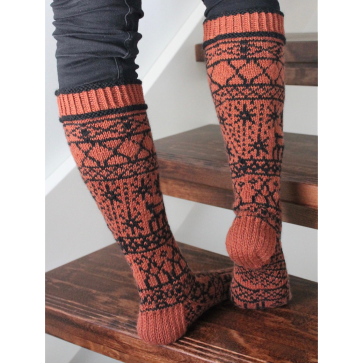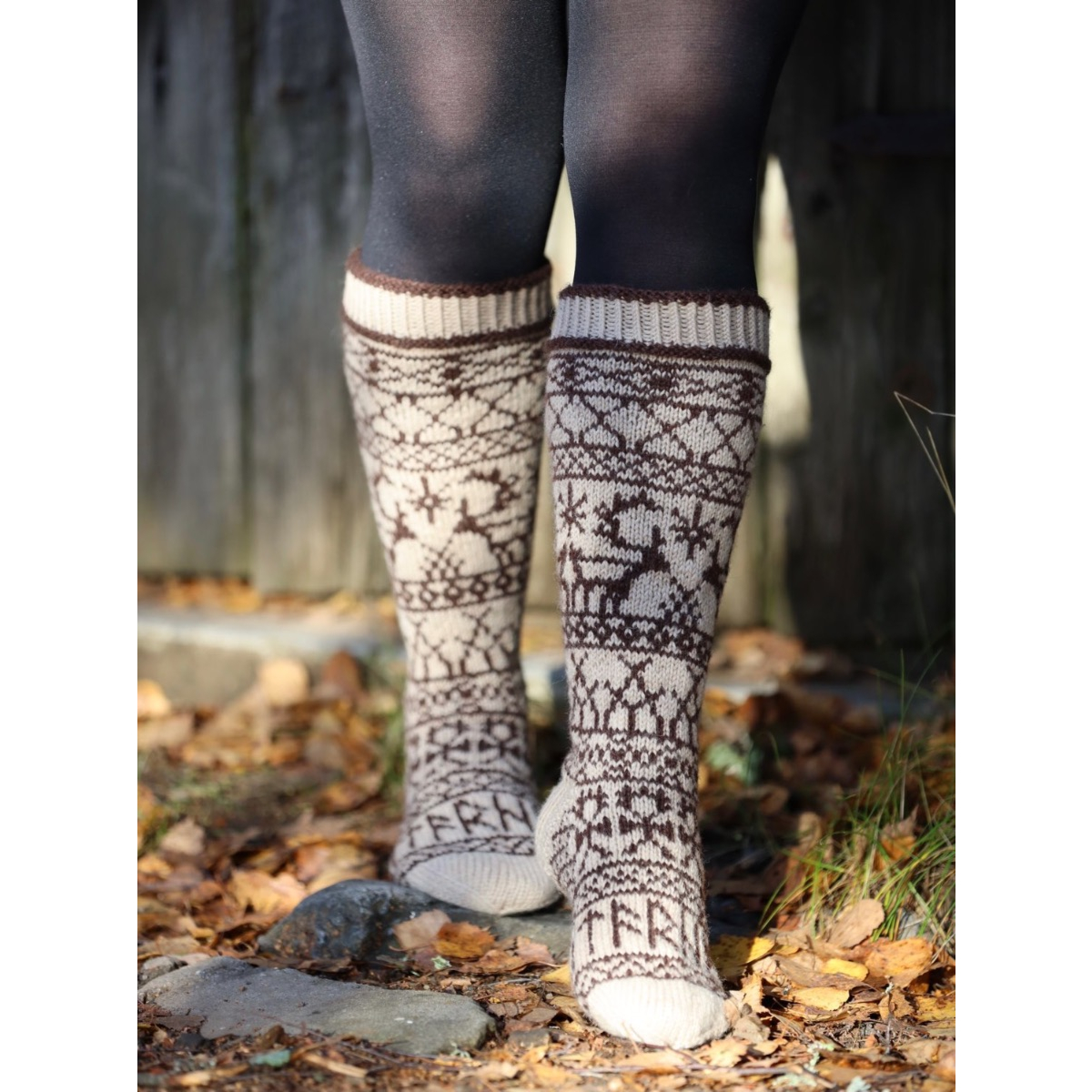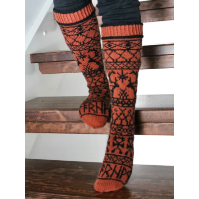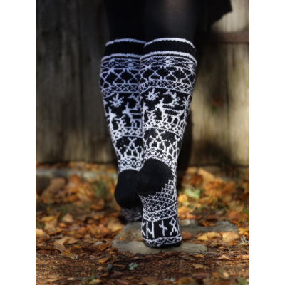 These socks were inspired by symbols used in shaman drums. They are made with thick machine washable sock yarn and available in multiple colours. There's also a mid calf version of this design available.