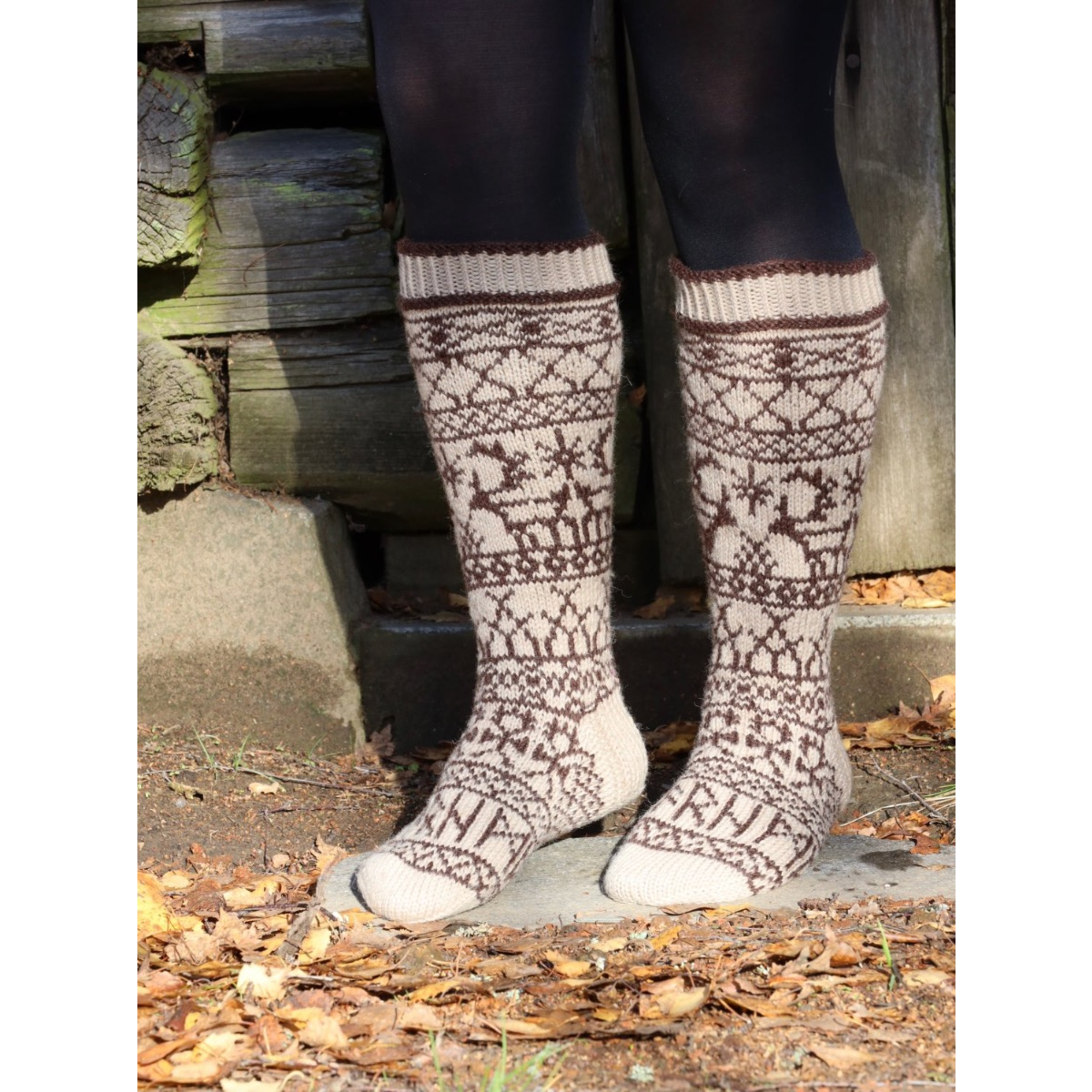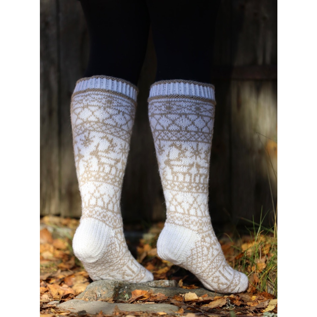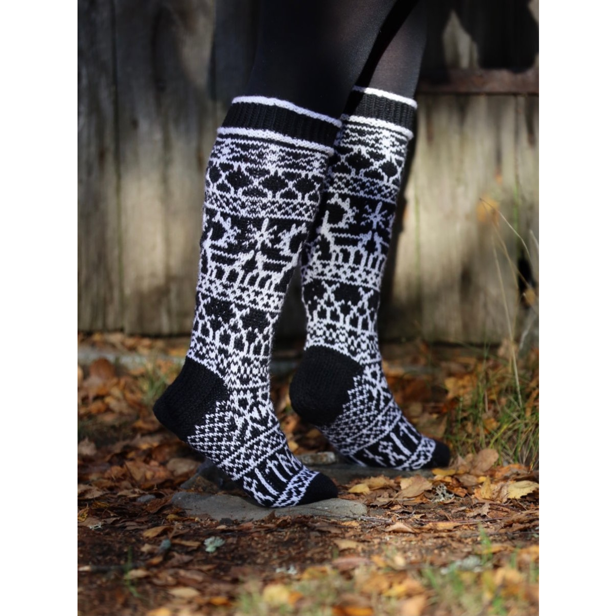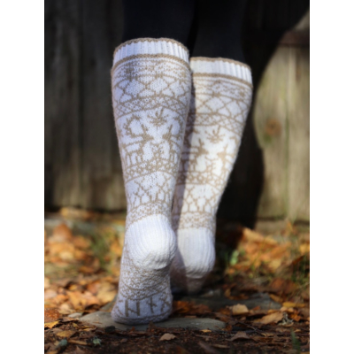 These socks were inspired by symbols used in shaman drums. They are made with thick machine washable sock yarn and available in multiple colours. There's also a mid calf version of this design available.