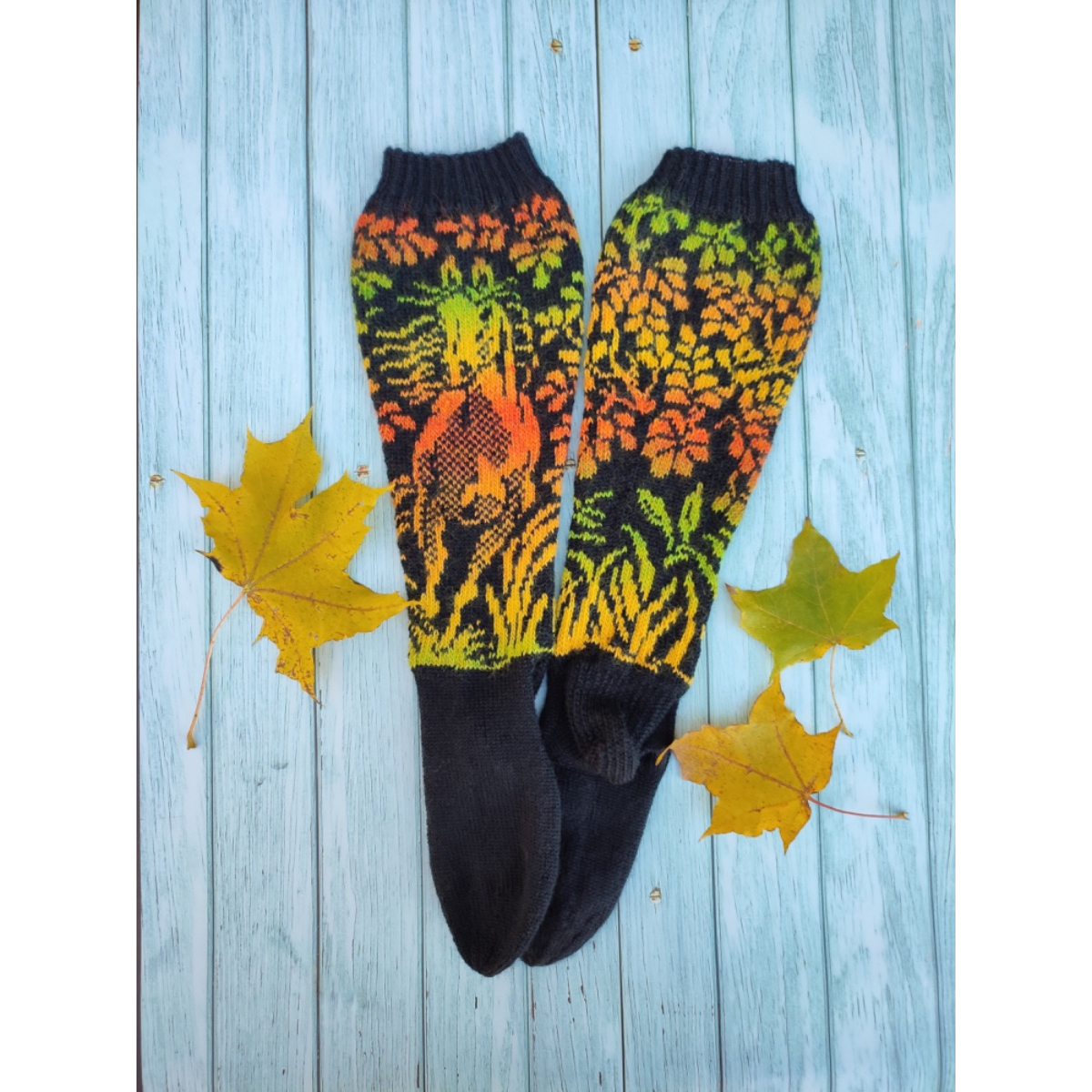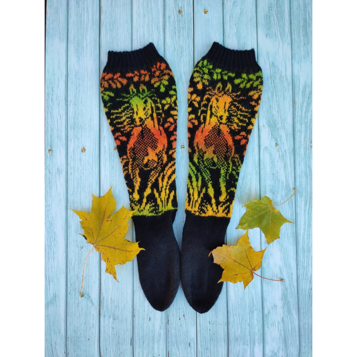 The Gallop Through the Woods socks are knitted on five double-pointed needles from the cuff down. The pattern incorporates a reinforced Dutch heel and a round toe. When choosing the colors, it is essential to make sure that Color A is darker than Color B, because switching the colors would create an unwanted negative effect.