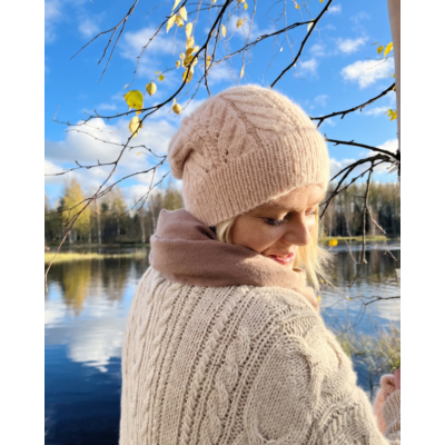 - Pipo: 2.5 mm kaapelipuikot (40 cm) joustinneuleeseen ja 3 mm kaapelipuikot pipon kuvio-osaan