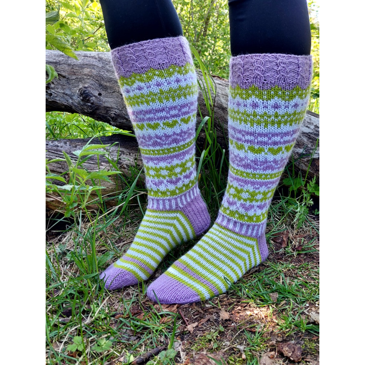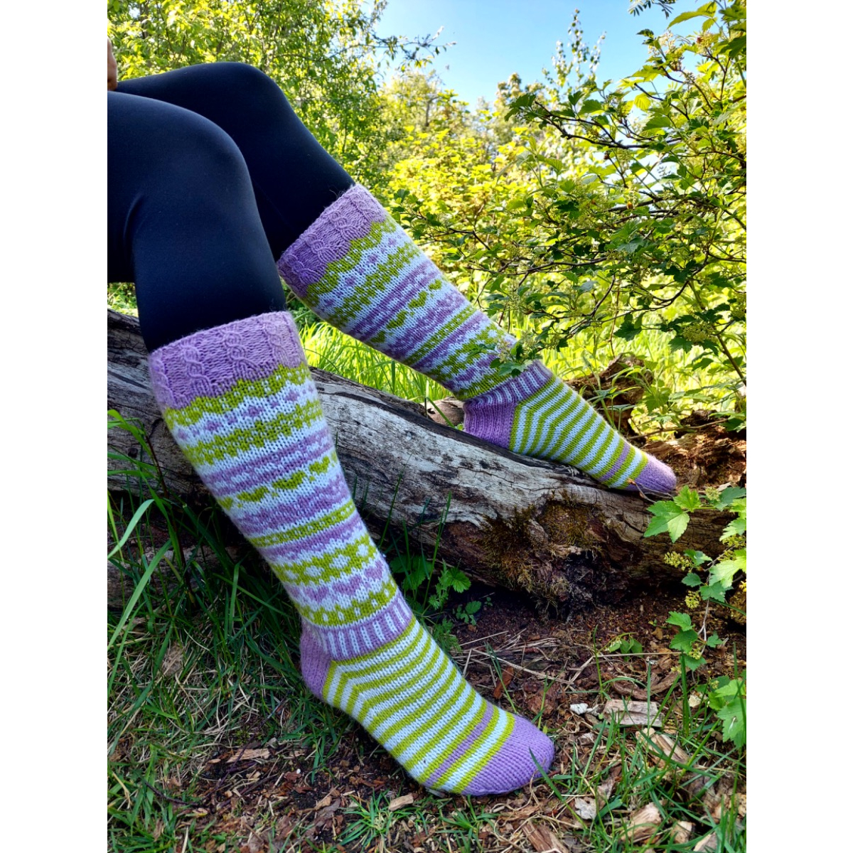 Suuri Käsityö-lehdelle alun perin suunnitellut hempeät JonSukat numerossa 5/2023. Kirjoneulepolvisukat kolmessa varren leveydessä, kapea (leveä) kurvikas. Jalkaterän koko muokattavissa moneen kokoon
