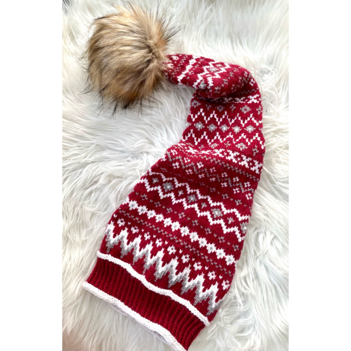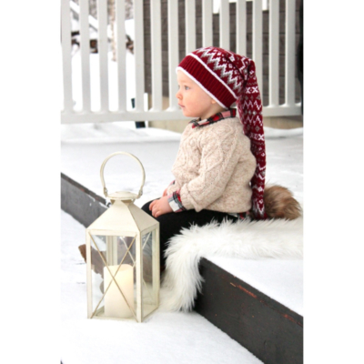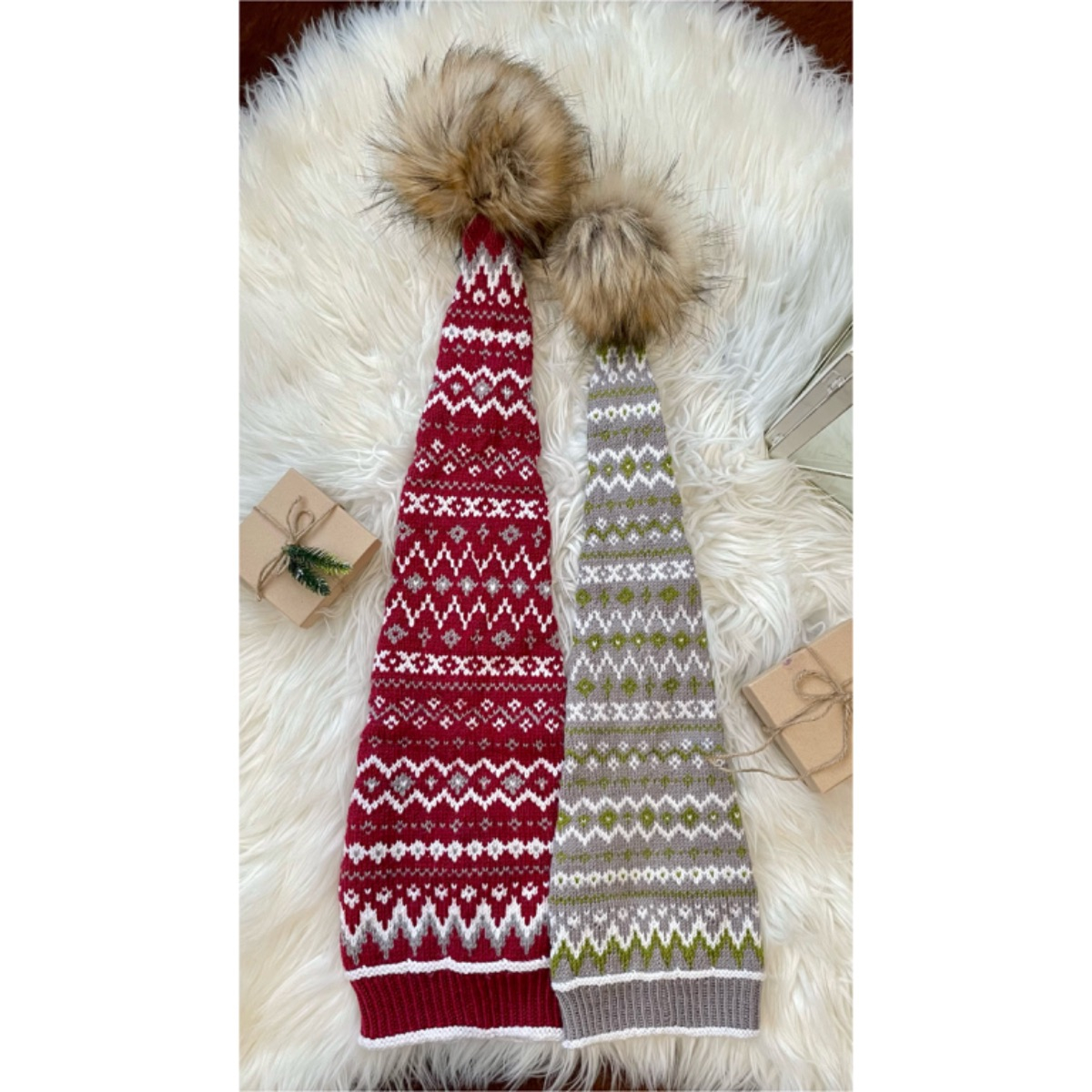 Saara Viljasen tonttulakista on suunniteltu lapsen ja aikuisen versio. Lapsen version saat neulomalla langalla, jonka juoksevuus on 100 g / 400 m. Aikuisen version saat samasta langasta kaksinkertaisena tai vaihtoehtoisesti langalla, jonka juoksevuus on 100 g / 200 m. Näin samat silmukkamäärät ja kaaviot toimivat ohjeen kummassakin koossa.